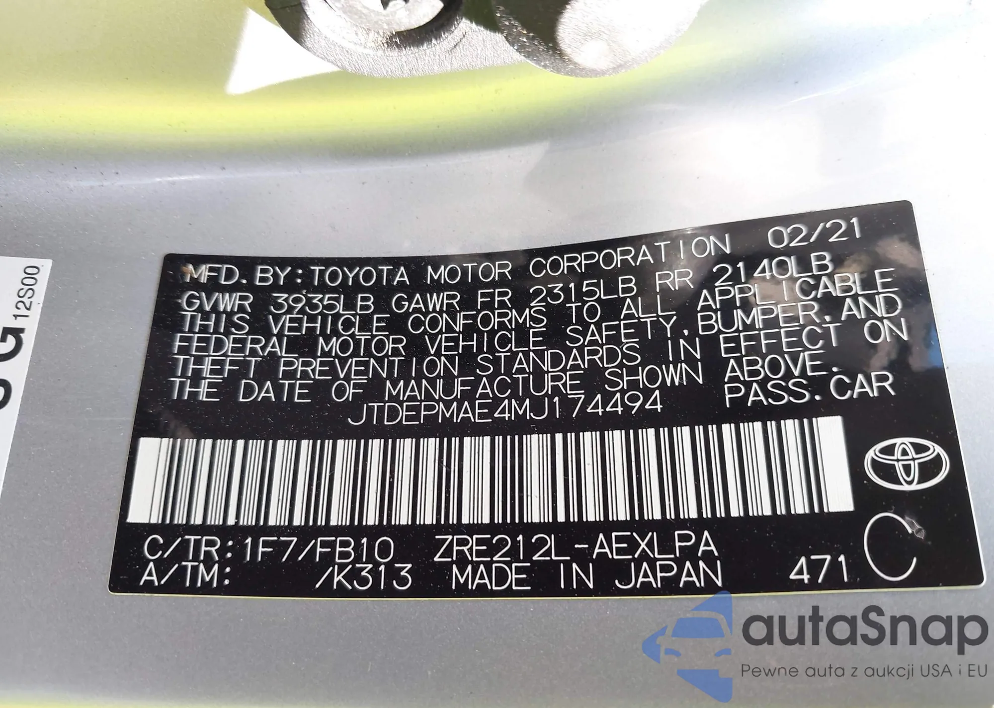 Samochód Toyota Corolla 2021 (VIN JTDEPMAE4MJ174494) był już licytowany 1 razy i/lub sprzedaje go niezweryfikowany sprzedawca. Zalecamy raport Carfax i potwierdzenie możliwości rejestracji pojazdu przed zakupem.