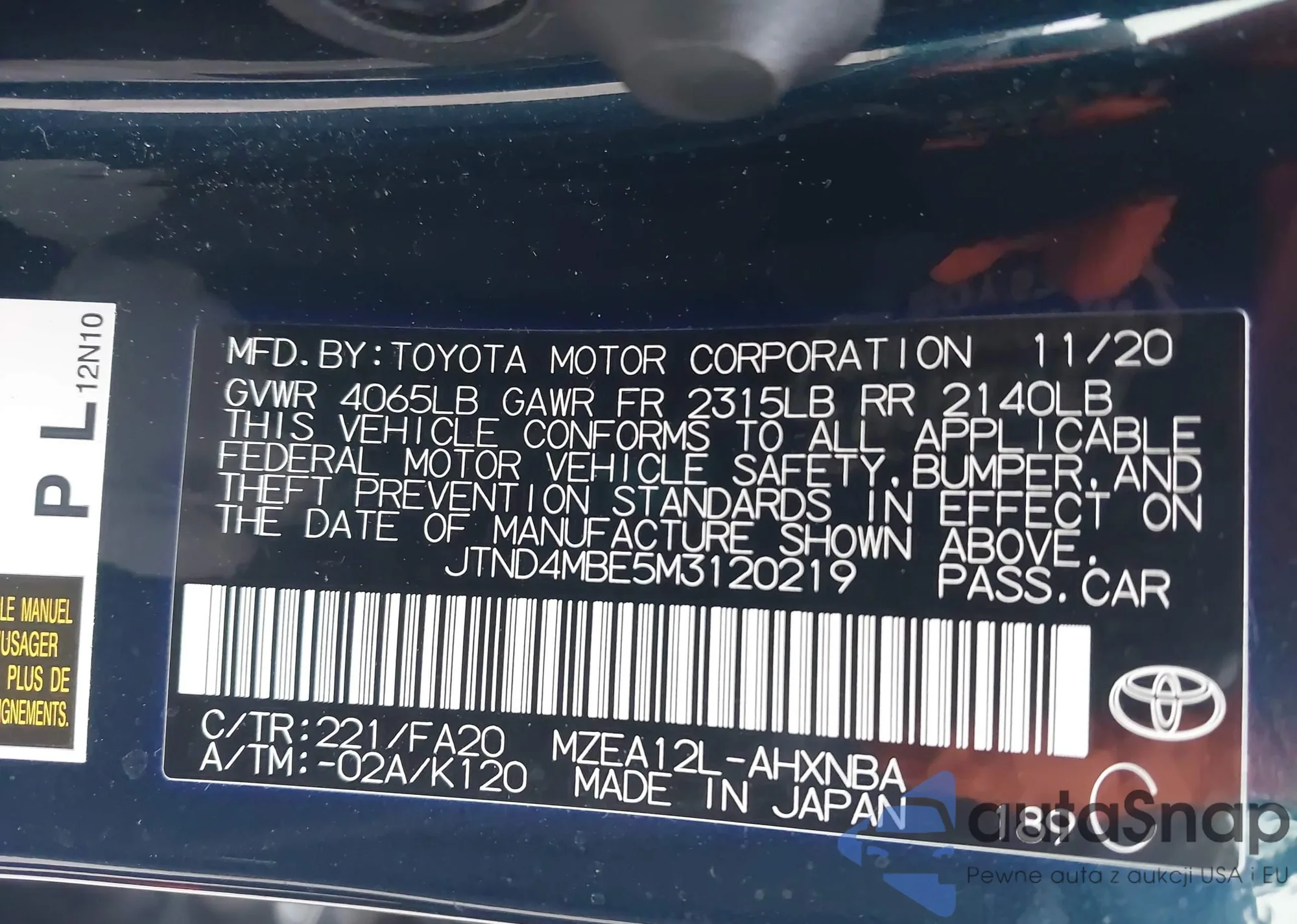 Samochód Toyota Corolla 2021 (VIN JTND4MBE5M3120219) nie był wcześniej licytowany. Dokumenty są czyste, przebieg odpowiada lub jest niższy niż średnia rynku. Sprzedaje go firma ubezpieczeniowa – polecamy zakup. Dostawa do portu zajmie ok. 6–8 tygodni.