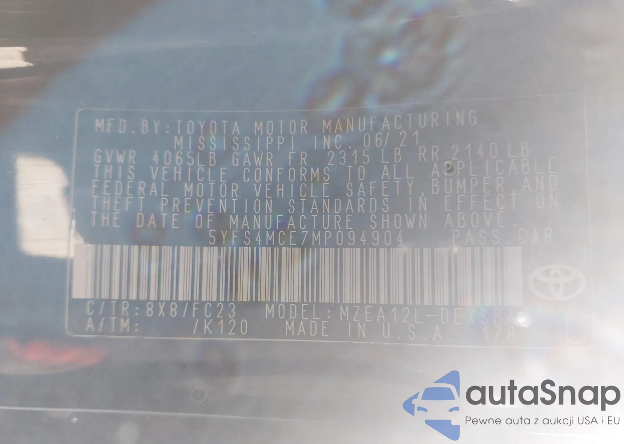 Samochód Toyota Corolla 2021 (VIN 5YFS4MCE7MP094904) nie był wcześniej licytowany. Dokumenty są czyste, przebieg odpowiada lub jest niższy niż średnia rynku. Sprzedaje go firma ubezpieczeniowa – polecamy zakup. Dostawa do portu zajmie ok. 6–8 tygodni.