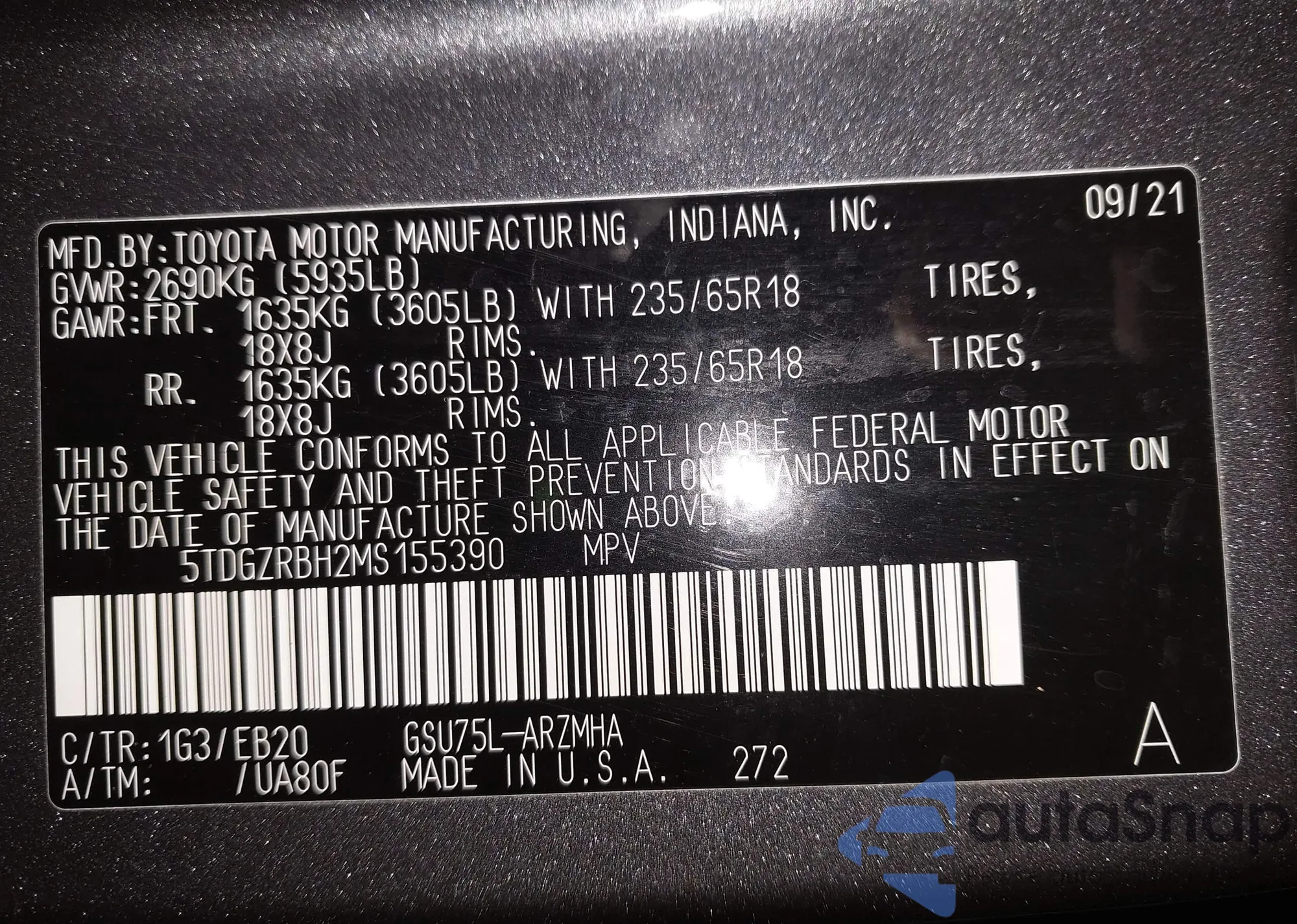 • VIN: 5TDGZRBH2MS155390
