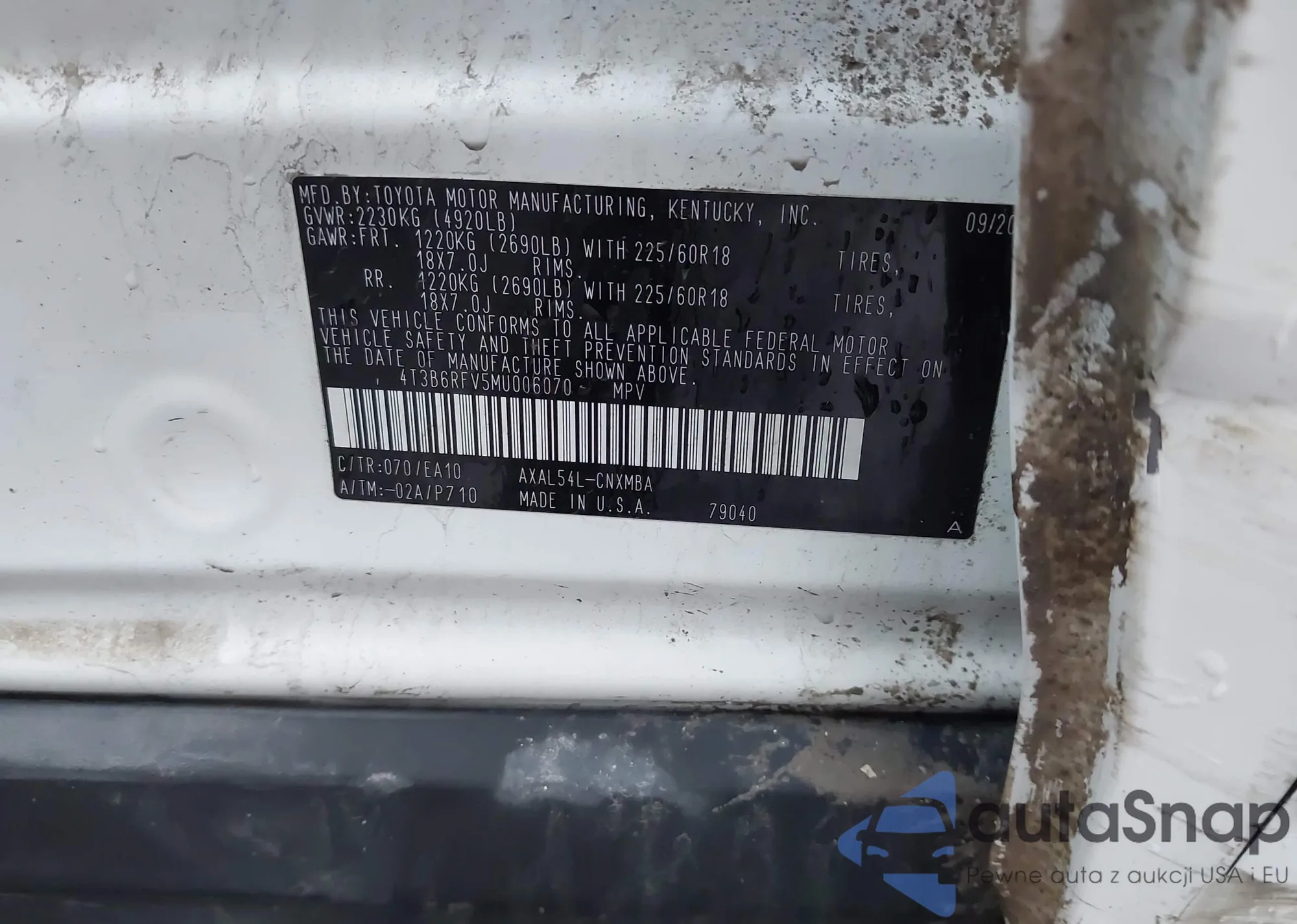 Samochód Toyota RAV 4 2021 (VIN 4T3B6RFV5MU006070) nie był wcześniej licytowany. Dokumenty są czyste, przebieg odpowiada lub jest niższy niż średnia rynku. Sprzedaje go firma ubezpieczeniowa – polecamy zakup. Dostawa do portu zajmie ok. 6–8 tygodni.