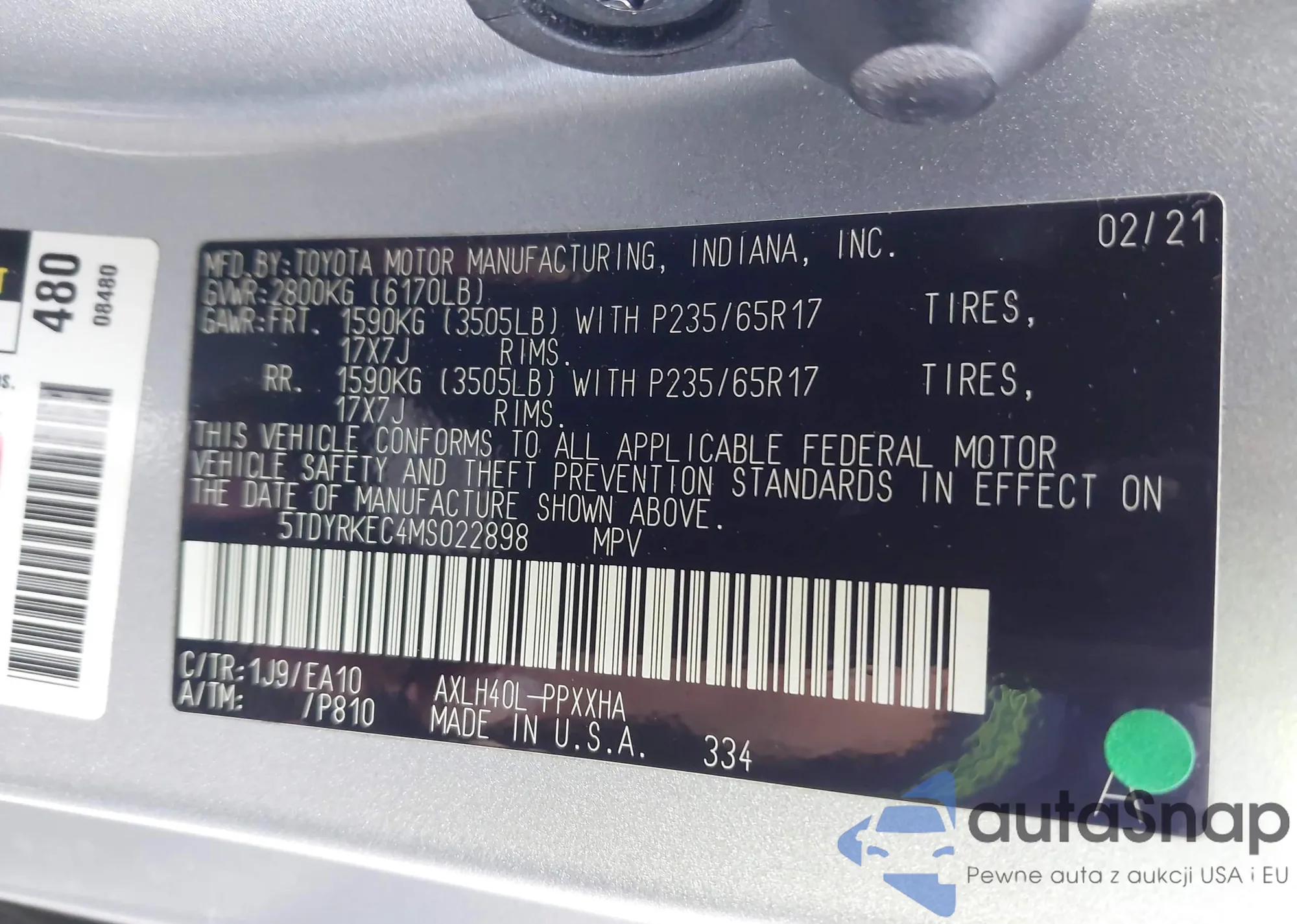 Samochód Toyota Sienna 2021 (VIN 5TDYRKEC4MS022898) nie był wcześniej licytowany. Dokumenty są czyste, przebieg odpowiada lub jest niższy niż średnia rynku. Sprzedaje go firma ubezpieczeniowa – polecamy zakup. Dostawa do portu zajmie ok. 6–8 tygodni.