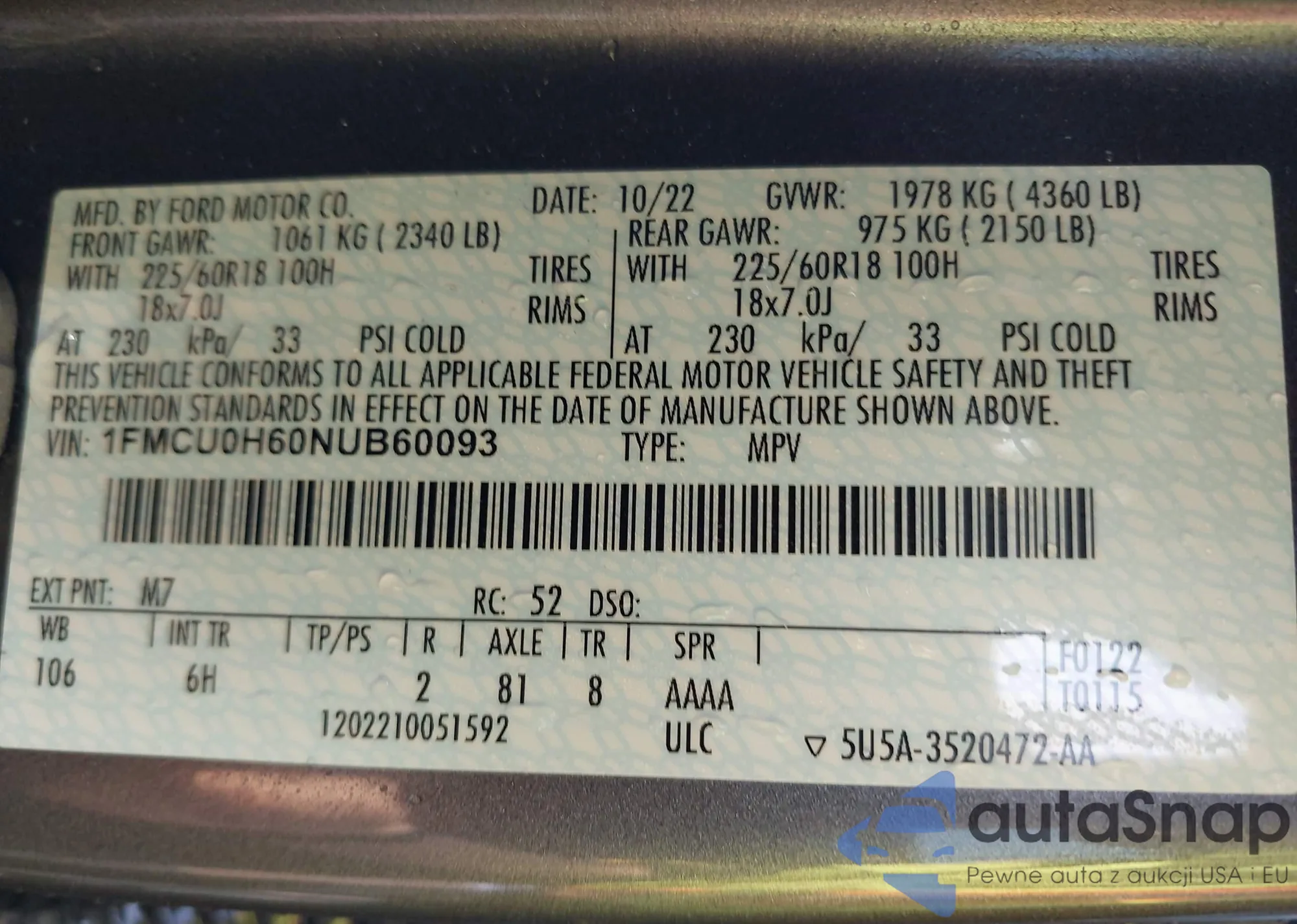 • VIN: 1FMCU0H60NUB60093