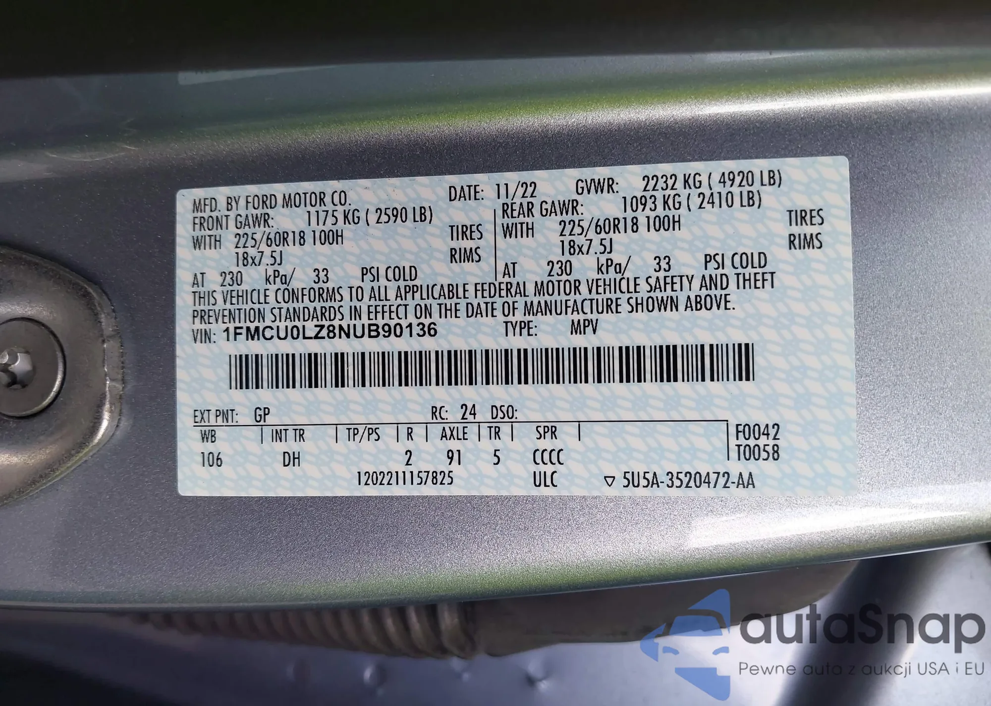 Samochód Ford Escape 2022 (VIN 1FMCU0LZ8NUB90136) ma dokumenty uniemożliwiające rejestrację. Mogą pojawić się trudności przy eksporcie i rejestracji. Skontaktuj się z ekspertami AutaSnap w celu znalezienia alternatywy.