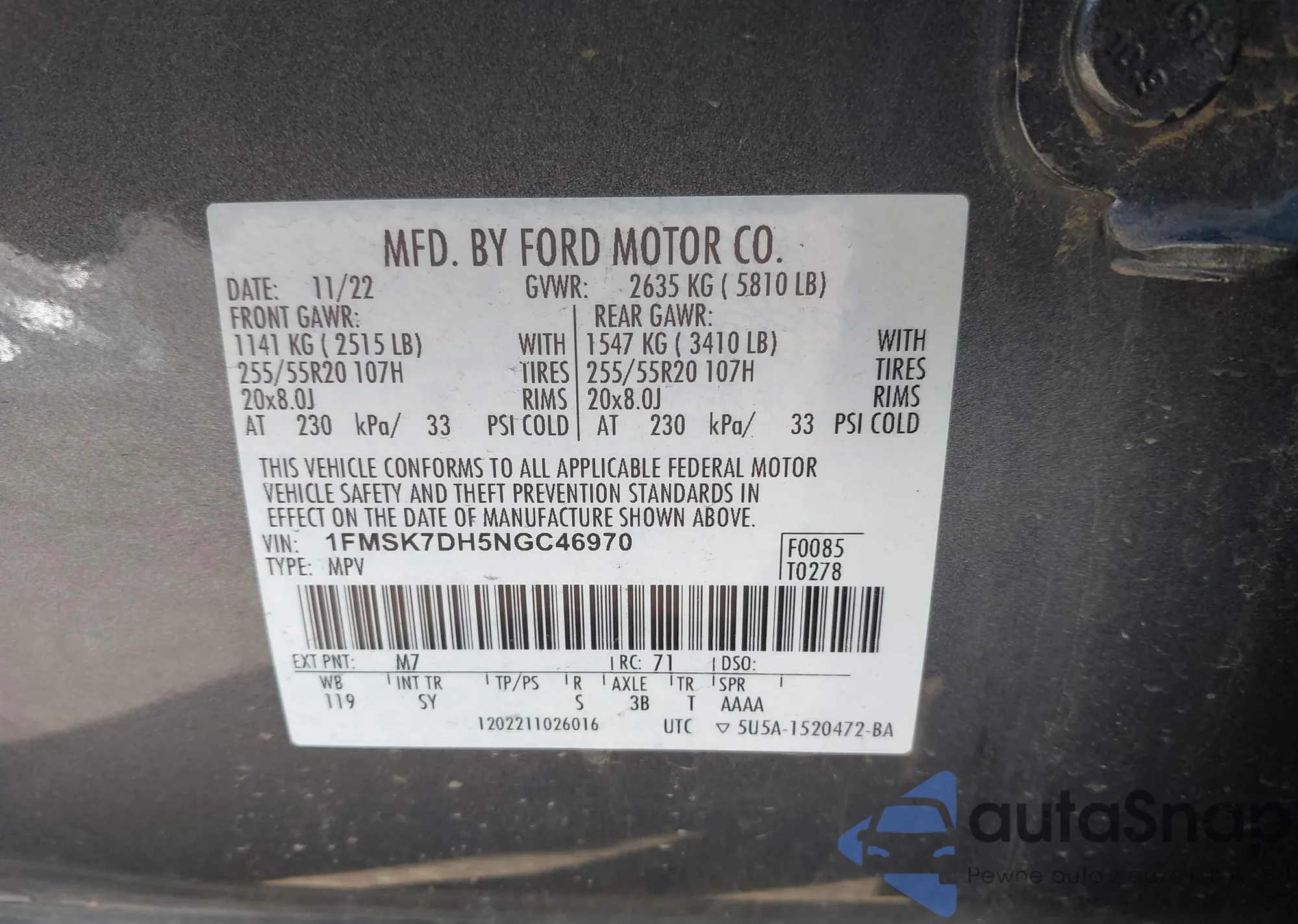 • VIN: 1FMSK7DH5NGC46970