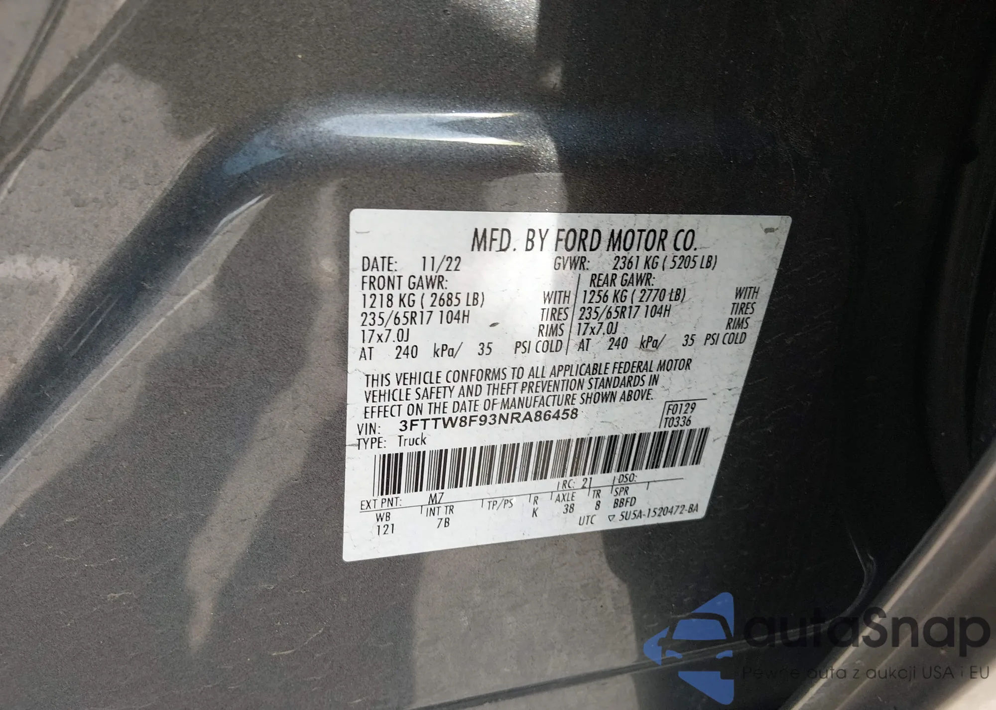 VIN: 3FTTW8F93NRA86458