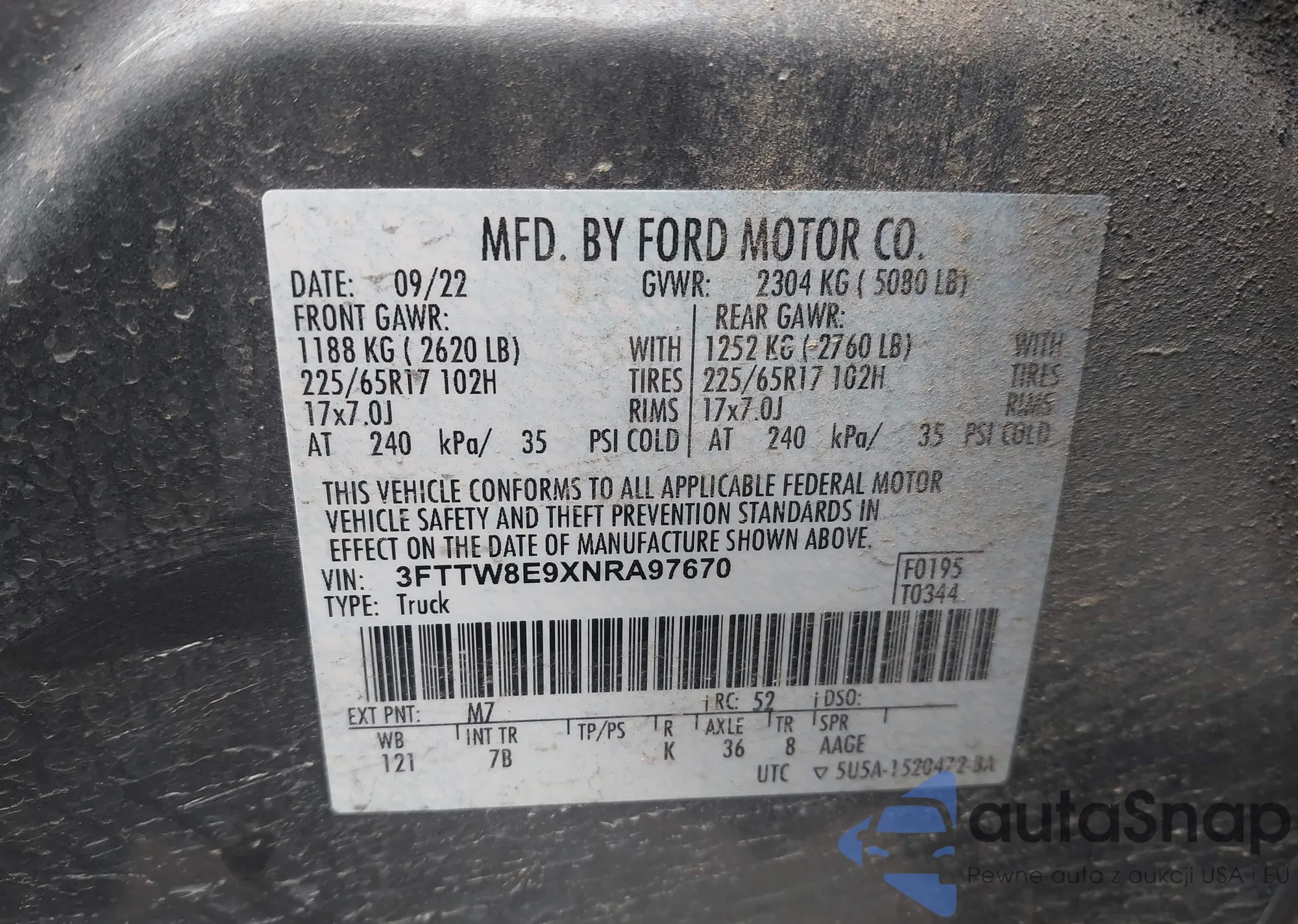 Samochód Ford Maverick 2022 (VIN 3FTTW8E9XNRA97670) nie był wcześniej licytowany. Dokumenty są czyste, przebieg odpowiada lub jest niższy niż średnia rynku. Sprzedaje go firma ubezpieczeniowa – polecamy zakup. Dostawa do portu zajmie ok. 6–8 tygodni.