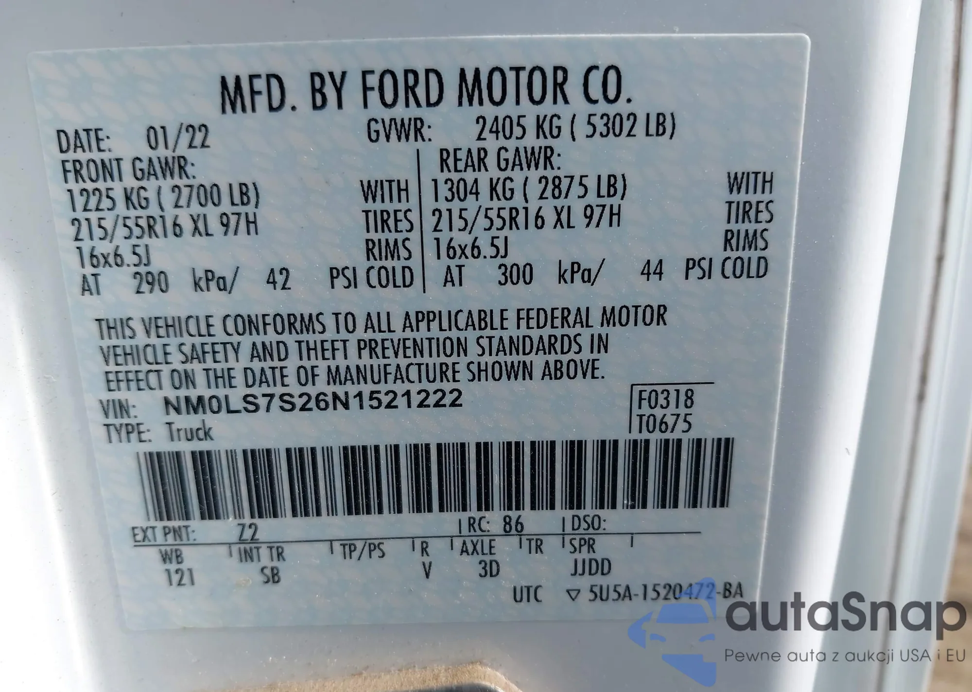 Samochód Ford Transit 2022 (VIN NM0LS7S26N1521222) nie był wcześniej licytowany. Dokumenty są czyste, przebieg odpowiada lub jest niższy niż średnia rynku. Sprzedaje go firma ubezpieczeniowa – polecamy zakup. Dostawa do portu zajmie ok. 6–8 tygodni.