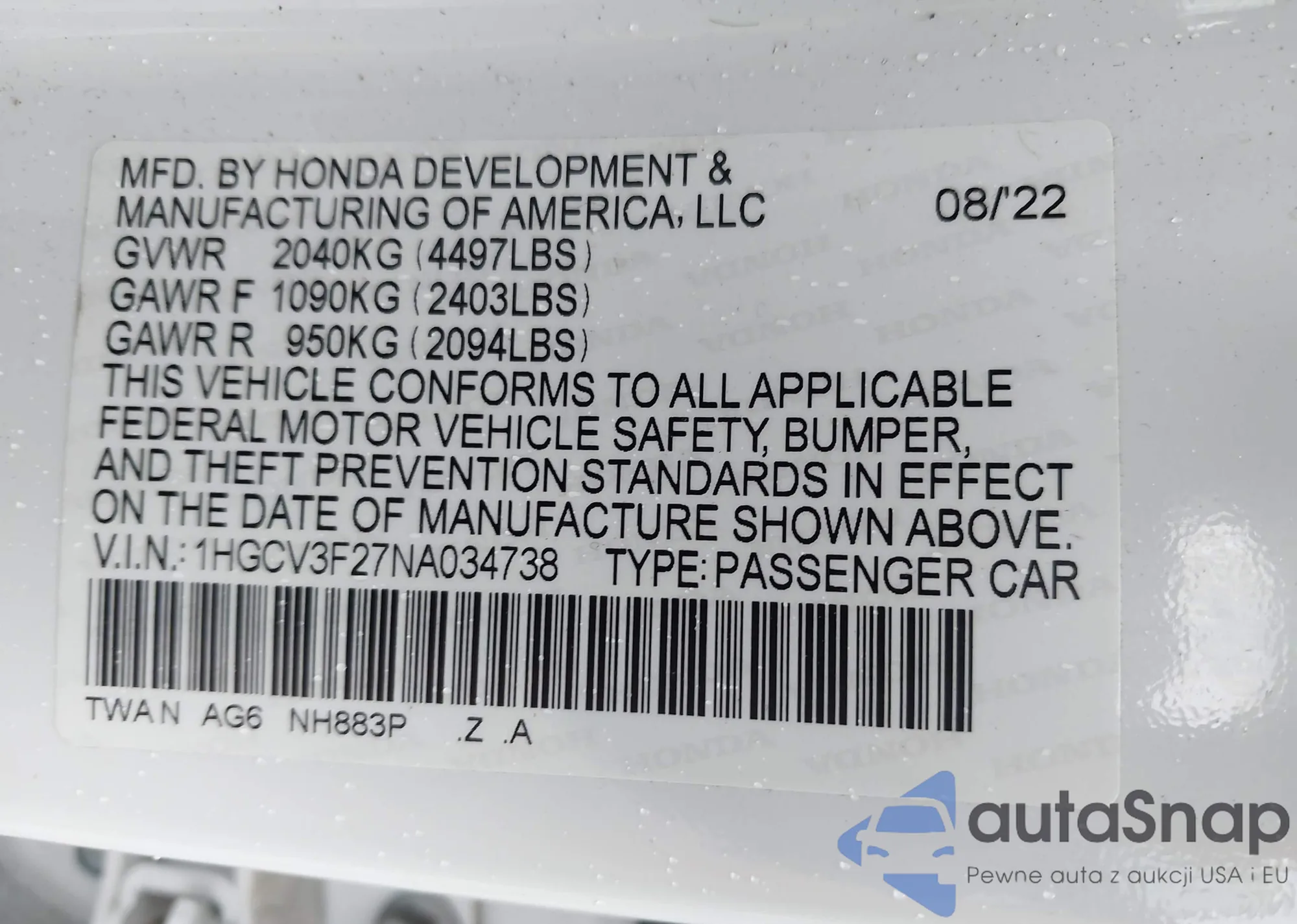VIN: 1HGCV3F27NA034738