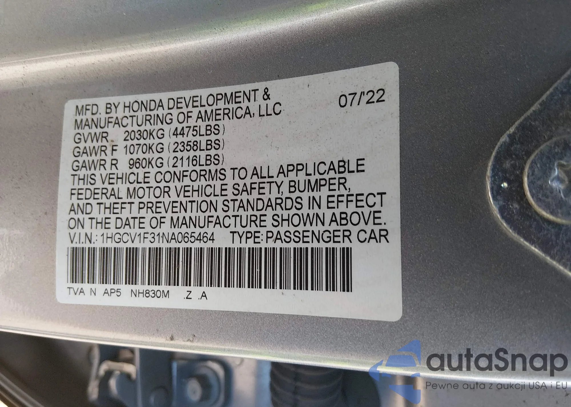 • VIN: 1HGCV1F31NA065464