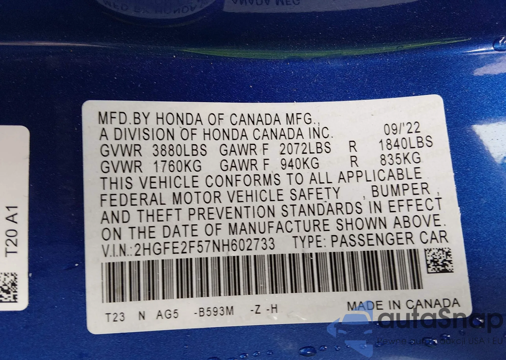 Samochód Honda Civic 2022 (VIN 2HGFE2F57NH602733) nie był wcześniej licytowany. Dokumenty są czyste, przebieg odpowiada lub jest niższy niż średnia rynku. Sprzedaje go firma ubezpieczeniowa – polecamy zakup. Dostawa do portu zajmie ok. 6–8 tygodni.
