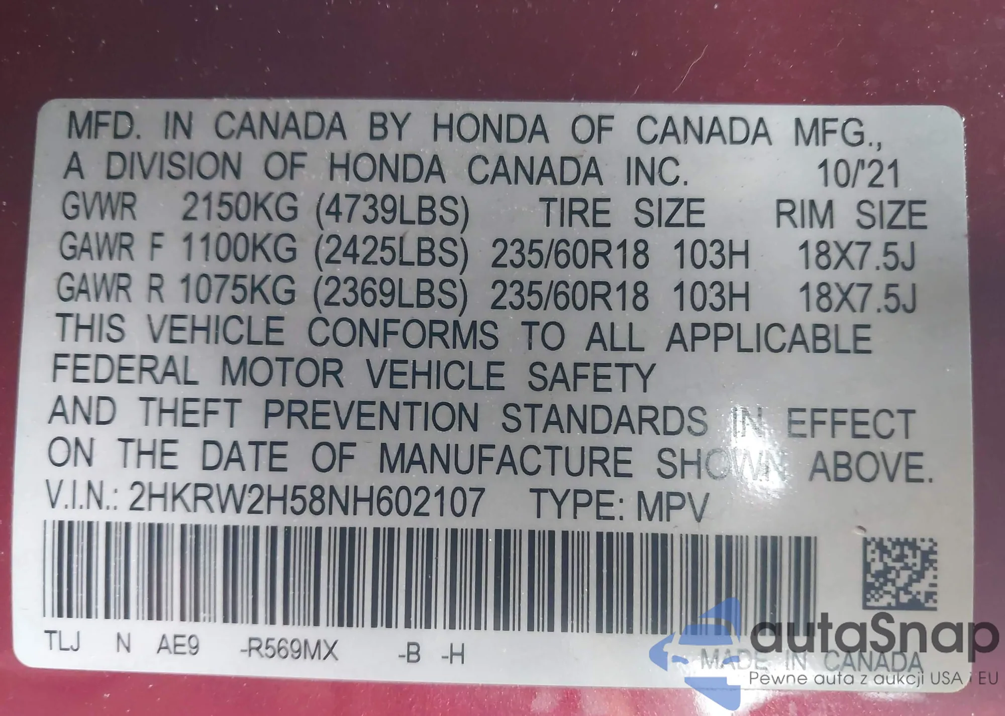 Samochód Honda CR-V 2022 (VIN 2HKRW2H58NH602107) nie był wcześniej licytowany. Dokumenty są czyste, przebieg odpowiada lub jest niższy niż średnia rynku. Sprzedaje go firma ubezpieczeniowa – polecamy zakup. Dostawa do portu zajmie ok. 6–8 tygodni.