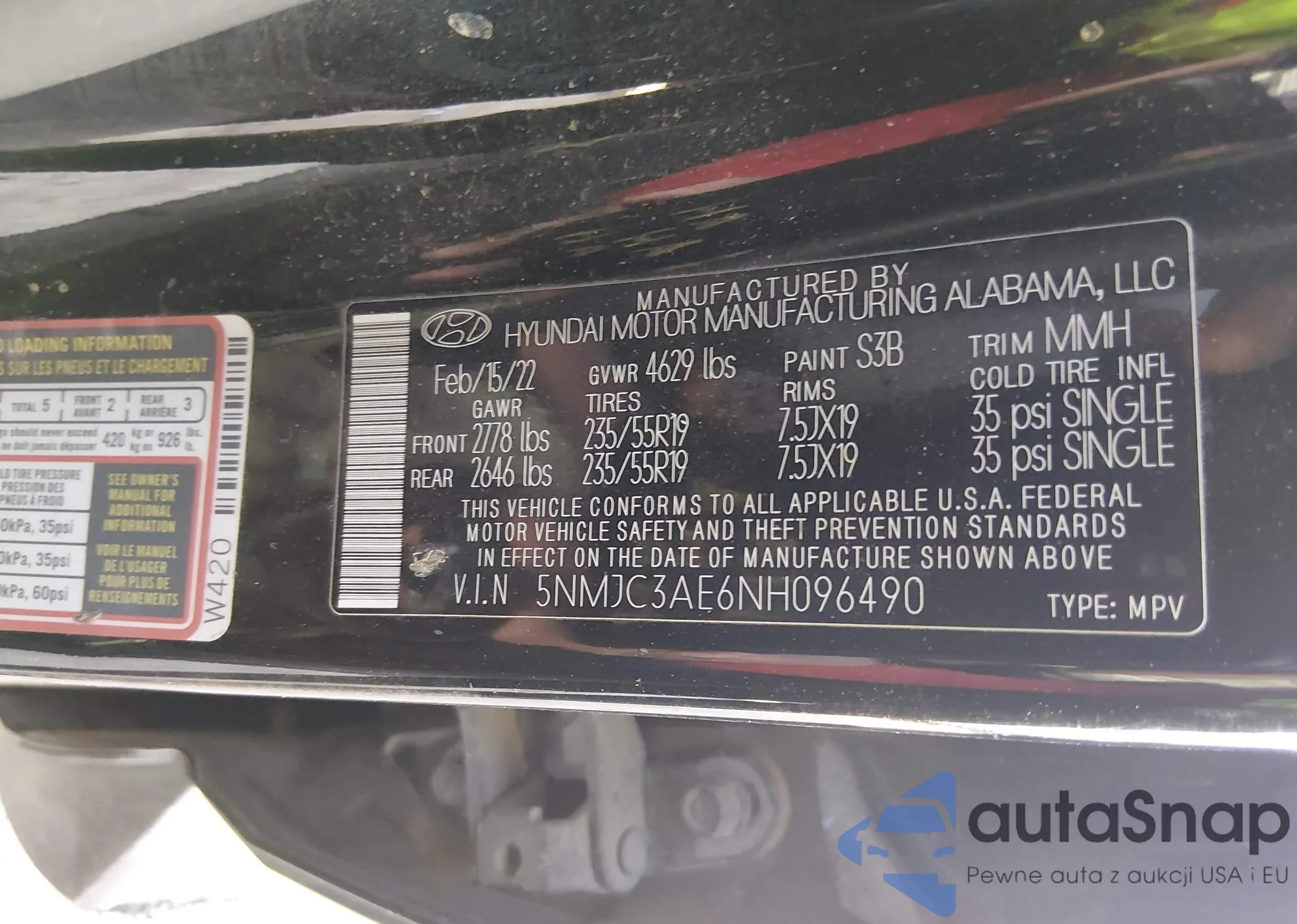 Samochód Hyundai Tucson 2022 (VIN 5NMJC3AE6NH096490) ma dokumenty uniemożliwiające rejestrację. Mogą pojawić się trudności przy eksporcie i rejestracji. Skontaktuj się z ekspertami AutaSnap w celu znalezienia alternatywy.