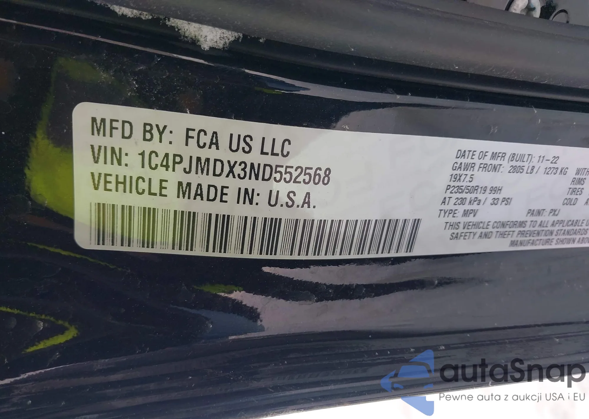 Samochód Jeep Cherokee 2022 (VIN 1C4PJMDX3ND552568) ma dokumenty uniemożliwiające rejestrację. Mogą pojawić się trudności przy eksporcie i rejestracji. Skontaktuj się z ekspertami AutaSnap w celu znalezienia alternatywy.