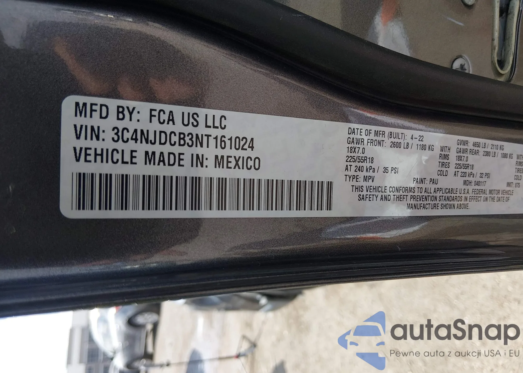 Samochód Jeep Compass 2022 (VIN 3C4NJDCB3NT161024) nie był wcześniej licytowany. Dokumenty są czyste, przebieg odpowiada lub jest niższy niż średnia rynku. Sprzedaje go firma ubezpieczeniowa – polecamy zakup. Dostawa do portu zajmie ok. 6–8 tygodni.