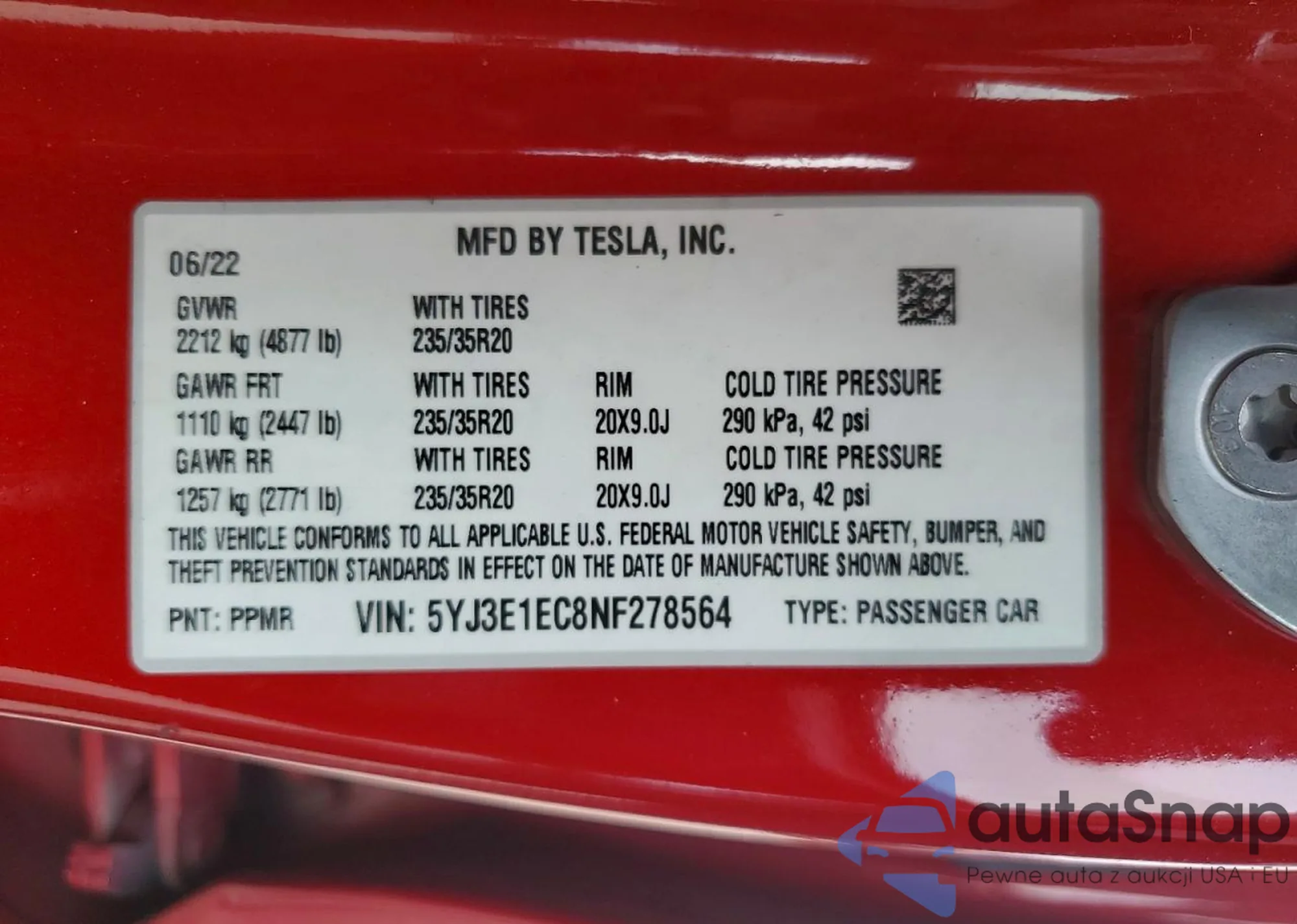 Samochód Tesla Model 3 2022 (VIN 5YJ3E1EC8NF278564) nie był wcześniej licytowany. Dokumenty są czyste, przebieg odpowiada lub jest niższy niż średnia rynku. Sprzedaje go firma ubezpieczeniowa – polecamy zakup. Dostawa do portu zajmie ok. 6–8 tygodni.