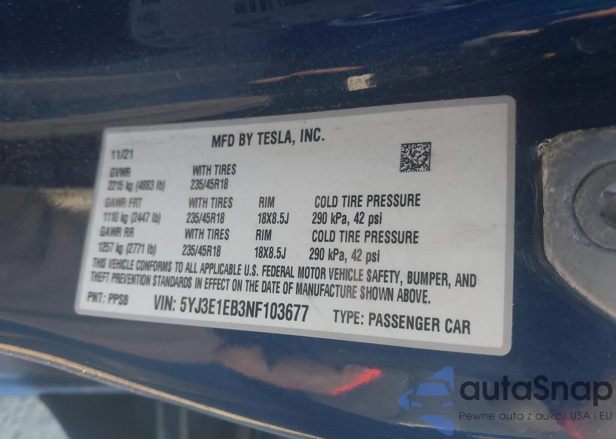 Samochód Tesla Model 3 2022 (VIN 5YJ3E1EB3NF103677) nie był wcześniej licytowany. Dokumenty są czyste, przebieg odpowiada lub jest niższy niż średnia rynku. Sprzedaje go firma ubezpieczeniowa – polecamy zakup. Dostawa do portu zajmie ok. 6–8 tygodni.