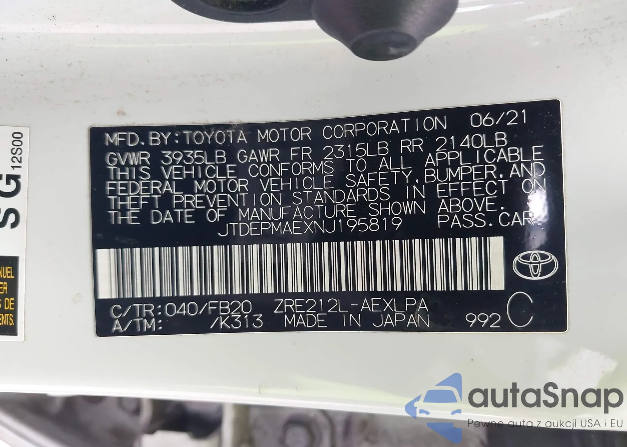Samochód Toyota Corolla 2022 (VIN JTDEPMAEXNJ195819) nie był wcześniej licytowany. Dokumenty są czyste, przebieg odpowiada lub jest niższy niż średnia rynku. Sprzedaje go firma ubezpieczeniowa – polecamy zakup. Dostawa do portu zajmie ok. 6–8 tygodni.