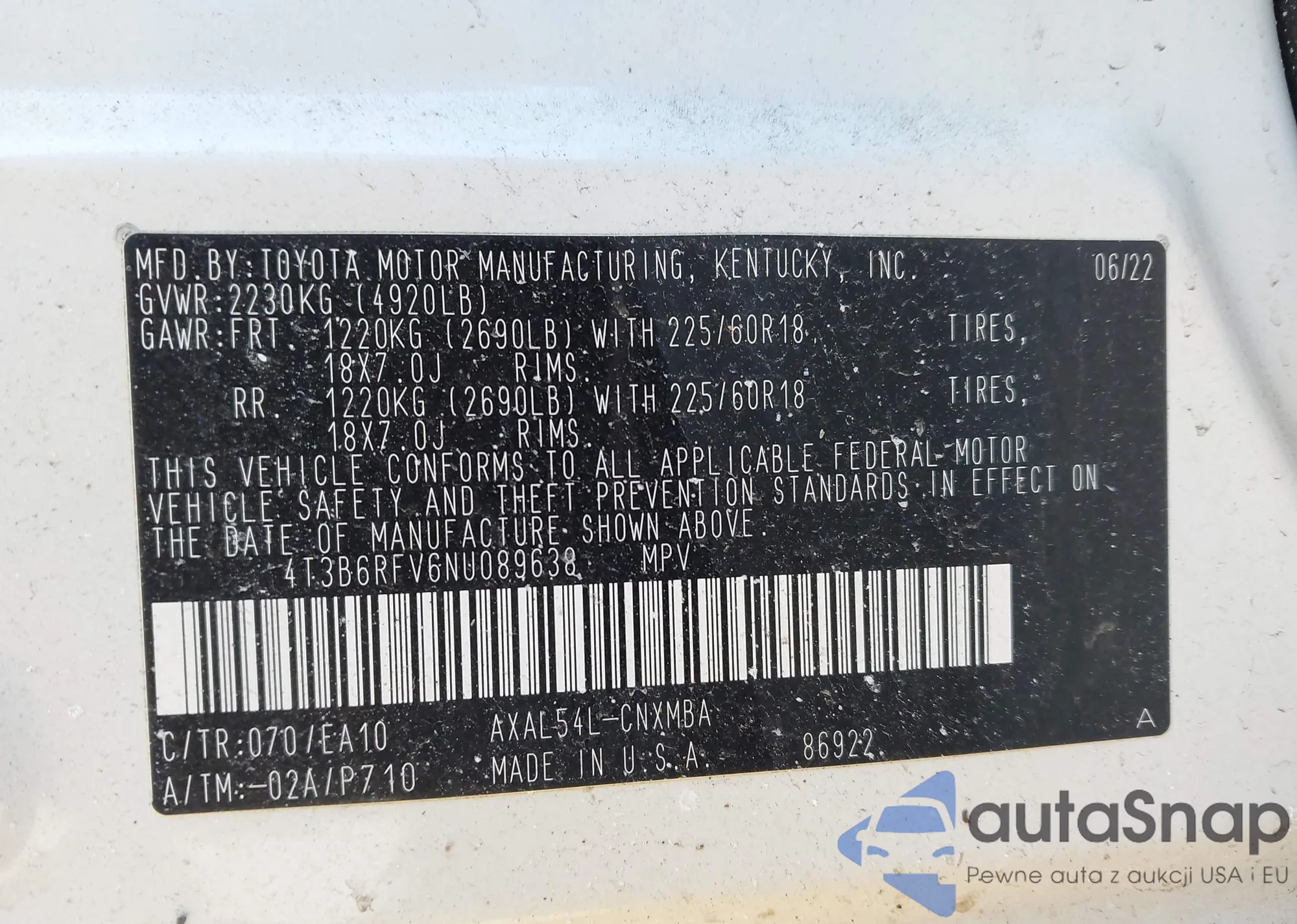 • VIN: 4T3B6RFV6NU089638