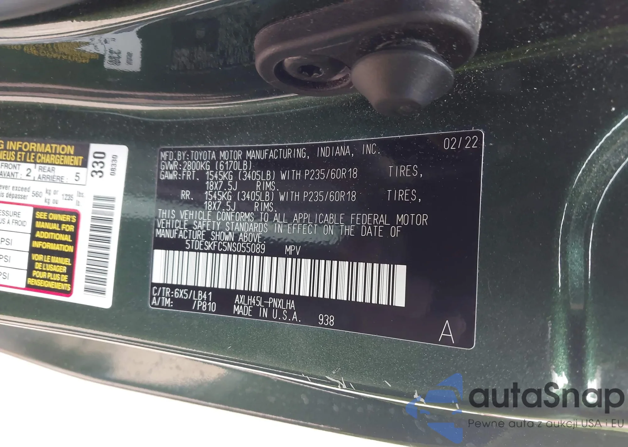 Samochód Toyota Sienna 2022 (VIN 5TDESKFC5NS055089) nie był wcześniej licytowany. Dokumenty są czyste, przebieg odpowiada lub jest niższy niż średnia rynku. Sprzedaje go firma ubezpieczeniowa – polecamy zakup. Dostawa do portu zajmie ok. 6–8 tygodni.