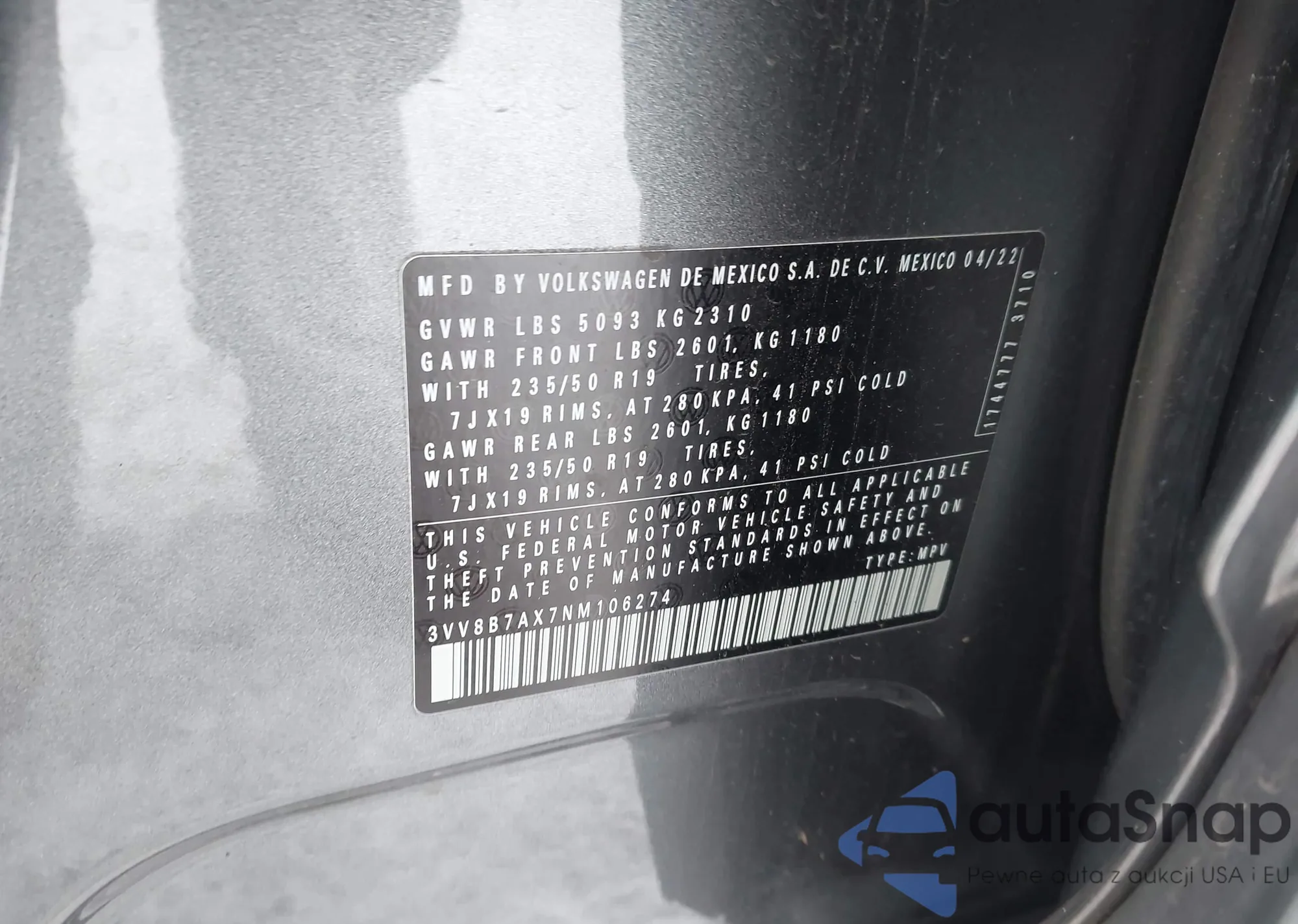 Samochód Volkswagen Tiguan 2022 (VIN 3VV8B7AX7NM106274) nie był wcześniej licytowany. Dokumenty są czyste, przebieg odpowiada lub jest niższy niż średnia rynku. Sprzedaje go firma ubezpieczeniowa – polecamy zakup. Dostawa do portu zajmie ok. 6–8 tygodni.