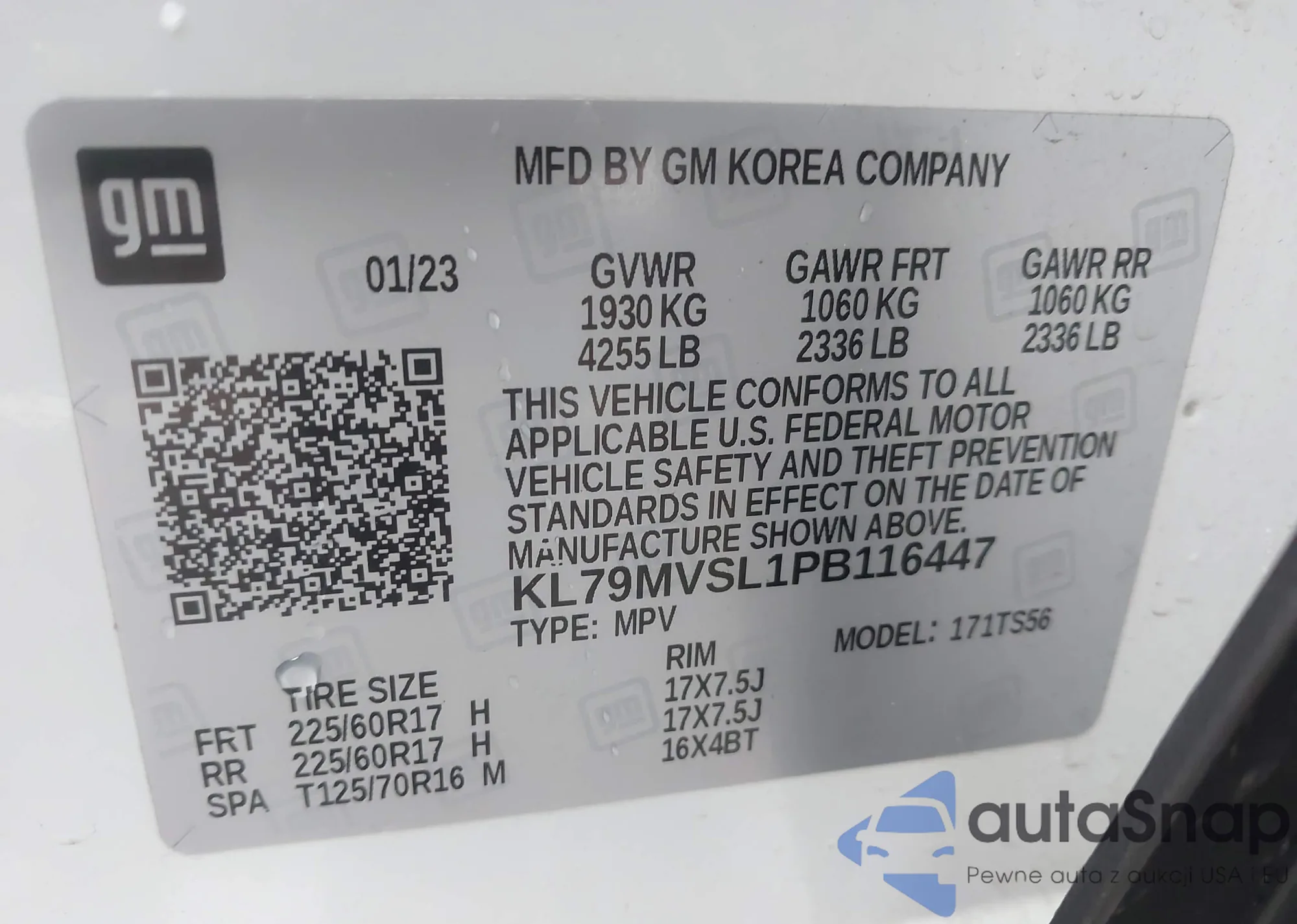 • VIN: KL79MVSL1PB116447