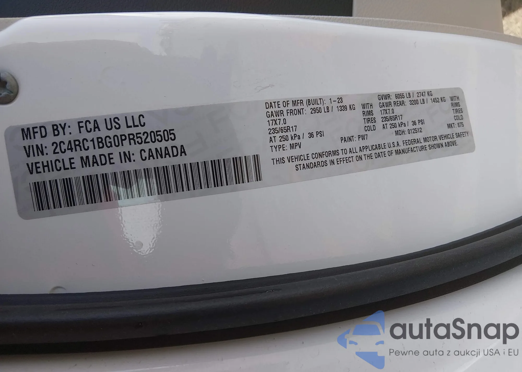 Samochód Chrysler Pacifica 2023 (VIN 2C4RC1BG0PR520505) nie był wcześniej licytowany. Dokumenty są czyste, przebieg odpowiada lub jest niższy niż średnia rynku. Sprzedaje go firma ubezpieczeniowa – polecamy zakup. Dostawa do portu zajmie ok. 6–8 tygodni.