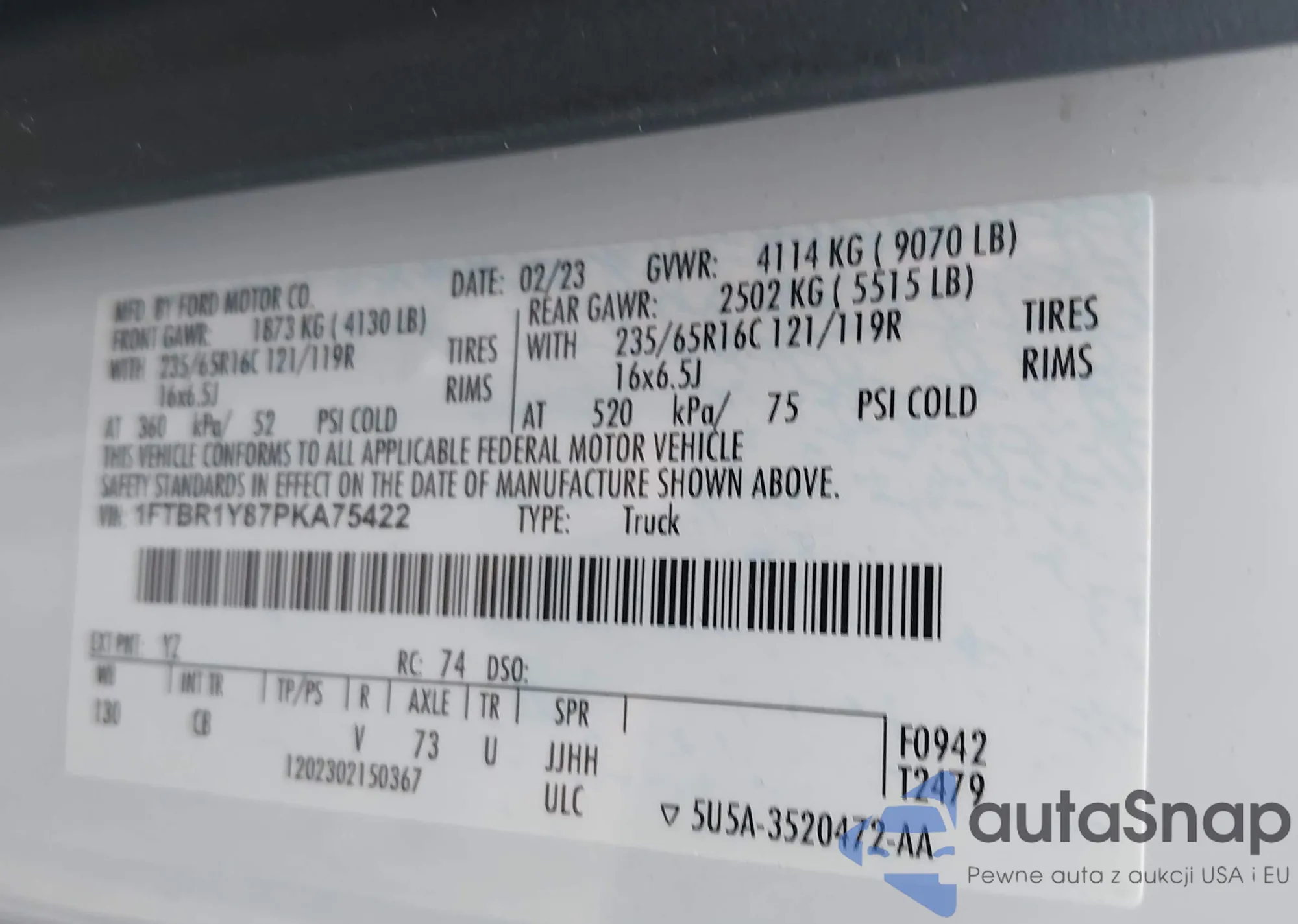 Samochód Ford Transit 2023 (VIN 1FTBR1Y87PKA75422) ma dokumenty uniemożliwiające rejestrację. Mogą pojawić się trudności przy eksporcie i rejestracji. Skontaktuj się z ekspertami AutaSnap w celu znalezienia alternatywy.
