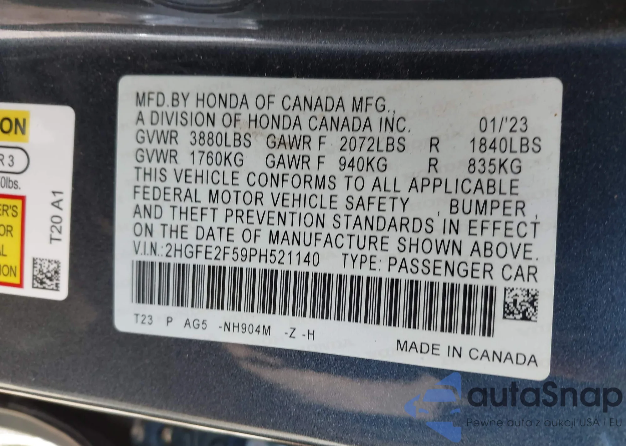Samochód Honda Civic 2023 (VIN 2HGFE2F59PH521140) nie był wcześniej licytowany. Dokumenty są czyste, przebieg odpowiada lub jest niższy niż średnia rynku. Sprzedaje go firma ubezpieczeniowa – polecamy zakup. Dostawa do portu zajmie ok. 6–8 tygodni.