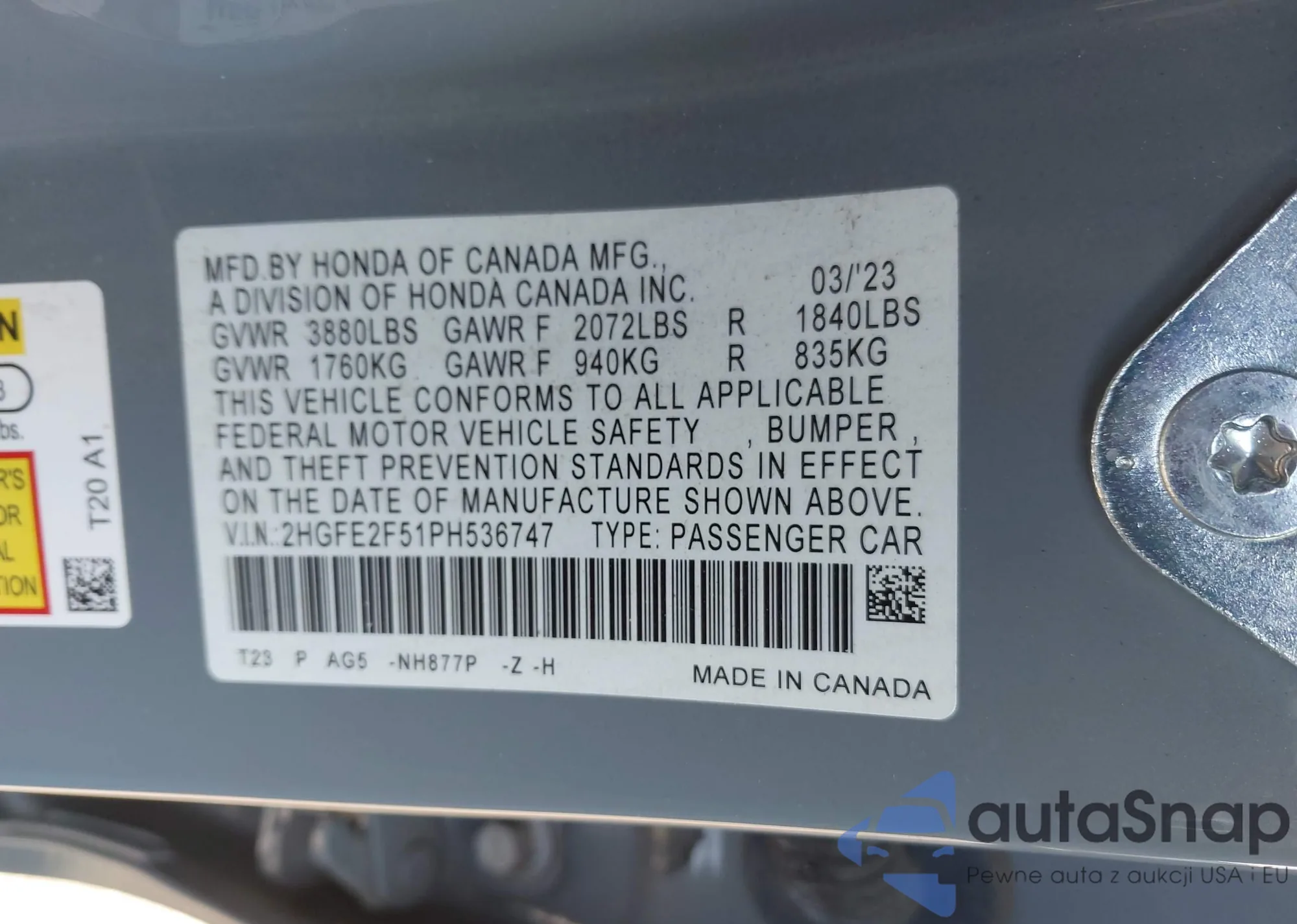 Samochód Honda Civic 2023 (VIN 2HGFE2F51PH536747) nie był wcześniej licytowany. Dokumenty są czyste, przebieg odpowiada lub jest niższy niż średnia rynku. Sprzedaje go firma ubezpieczeniowa – polecamy zakup. Dostawa do portu zajmie ok. 6–8 tygodni.