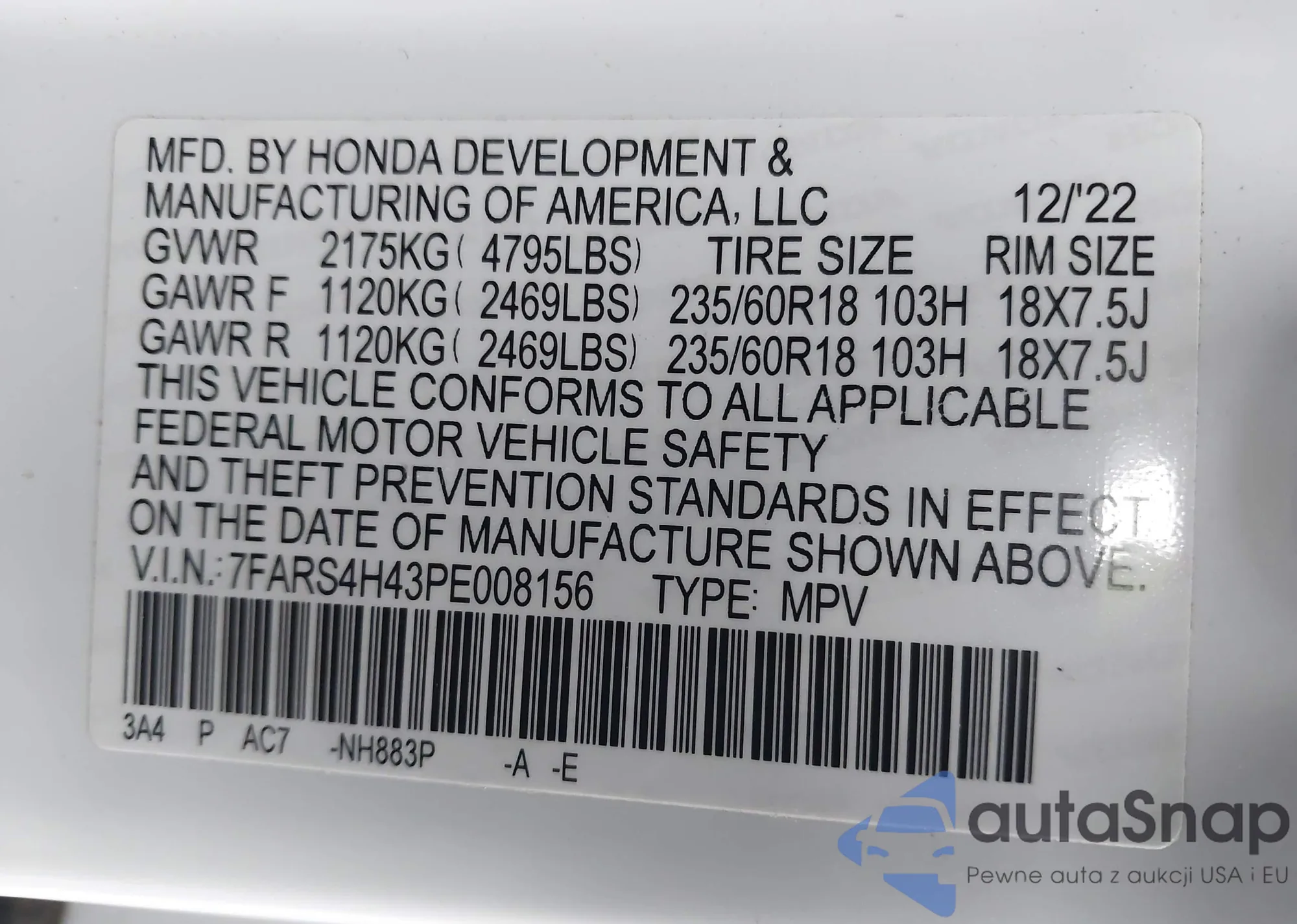 Samochód Honda CR-V 2023 (VIN 7FARS4H43PE008156) nie był wcześniej licytowany. Dokumenty są czyste, przebieg odpowiada lub jest niższy niż średnia rynku. Sprzedaje go firma ubezpieczeniowa – polecamy zakup. Dostawa do portu zajmie ok. 6–8 tygodni.