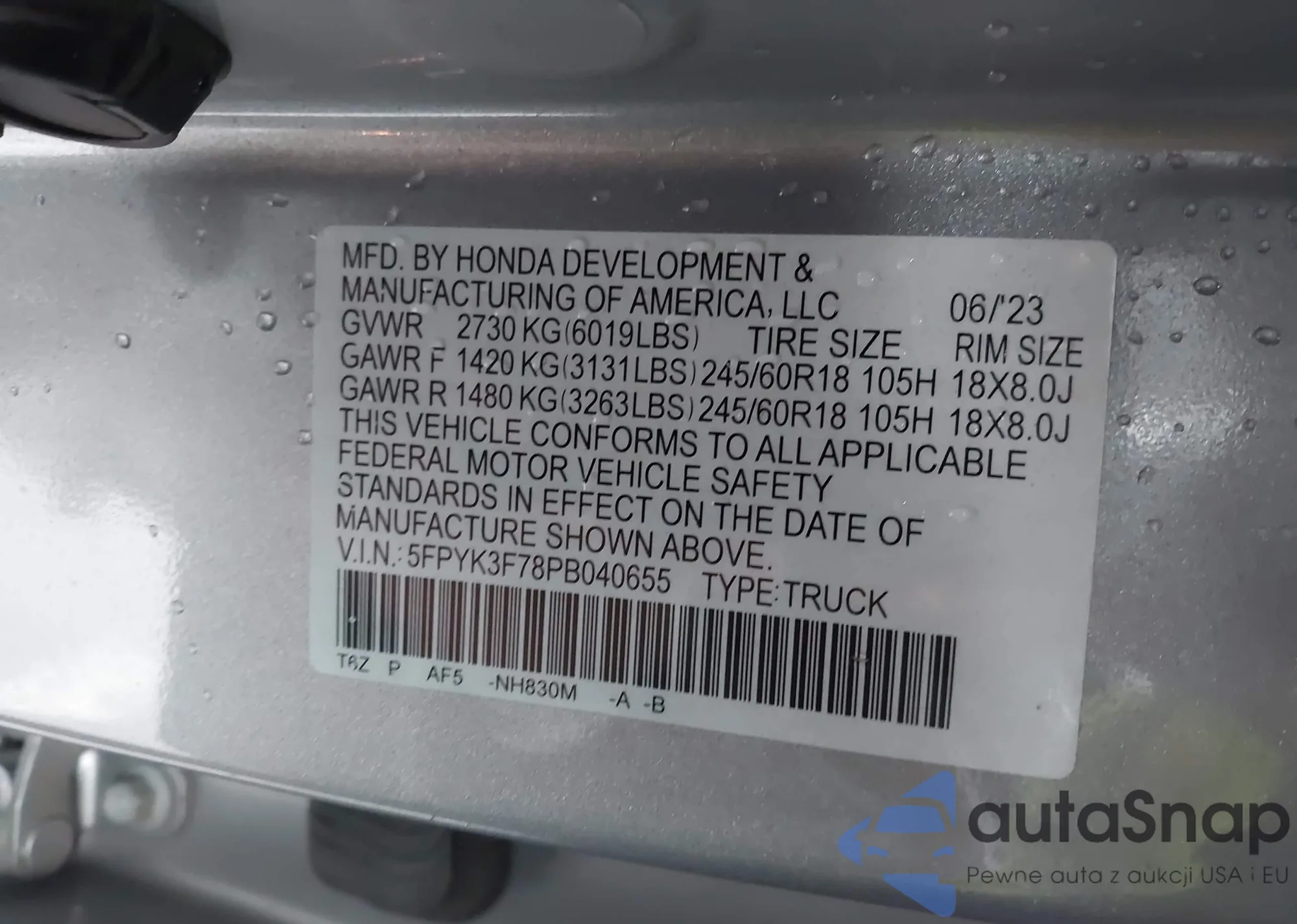 Samochód Honda Ridgeline 2023 (VIN 5FPYK3F78PB040655) nie był wcześniej licytowany. Dokumenty są czyste, przebieg odpowiada lub jest niższy niż średnia rynku. Sprzedaje go firma ubezpieczeniowa – polecamy zakup. Dostawa do portu zajmie ok. 6–8 tygodni.
