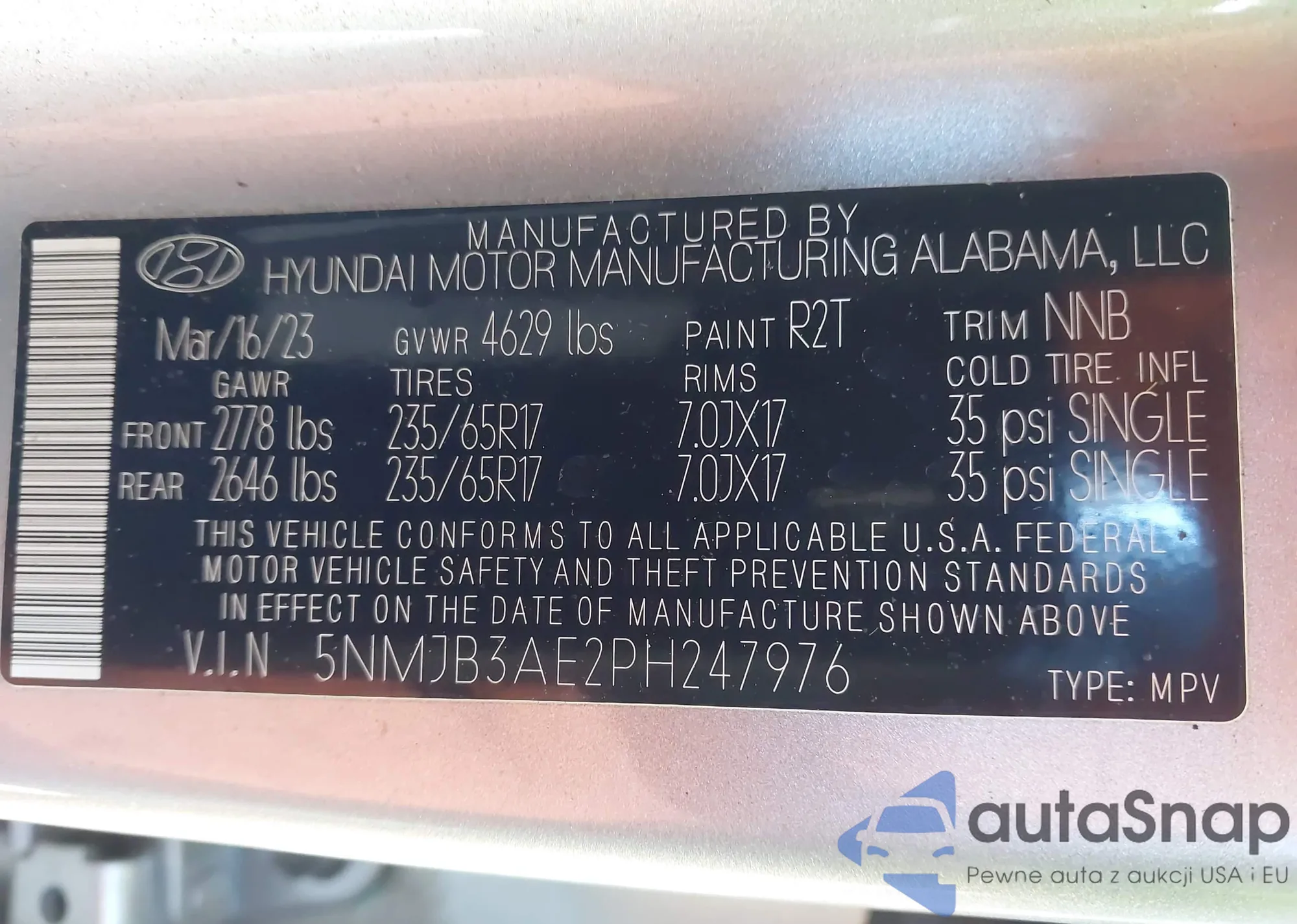 Samochód Hyundai Tucson 2023 (VIN 5NMJB3AE2PH247976) nie był wcześniej licytowany. Dokumenty są czyste, przebieg odpowiada lub jest niższy niż średnia rynku. Sprzedaje go firma ubezpieczeniowa – polecamy zakup. Dostawa do portu zajmie ok. 6–8 tygodni.