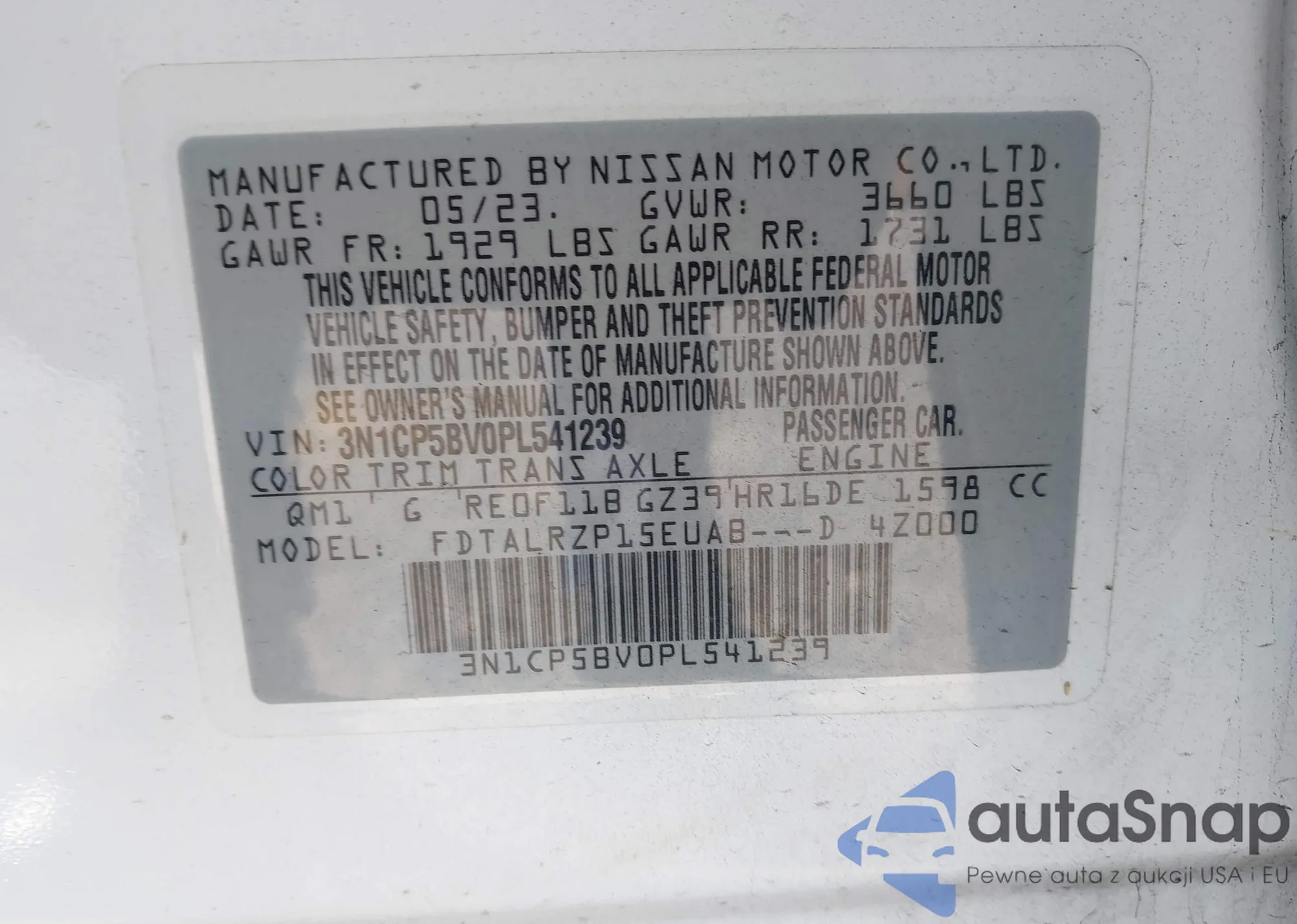 Samochód Nissan Kicks 2023 (VIN 3N1CP5BV0PL541239) ma dokumenty uniemożliwiające rejestrację. Mogą pojawić się trudności przy eksporcie i rejestracji. Skontaktuj się z ekspertami AutaSnap w celu znalezienia alternatywy.
