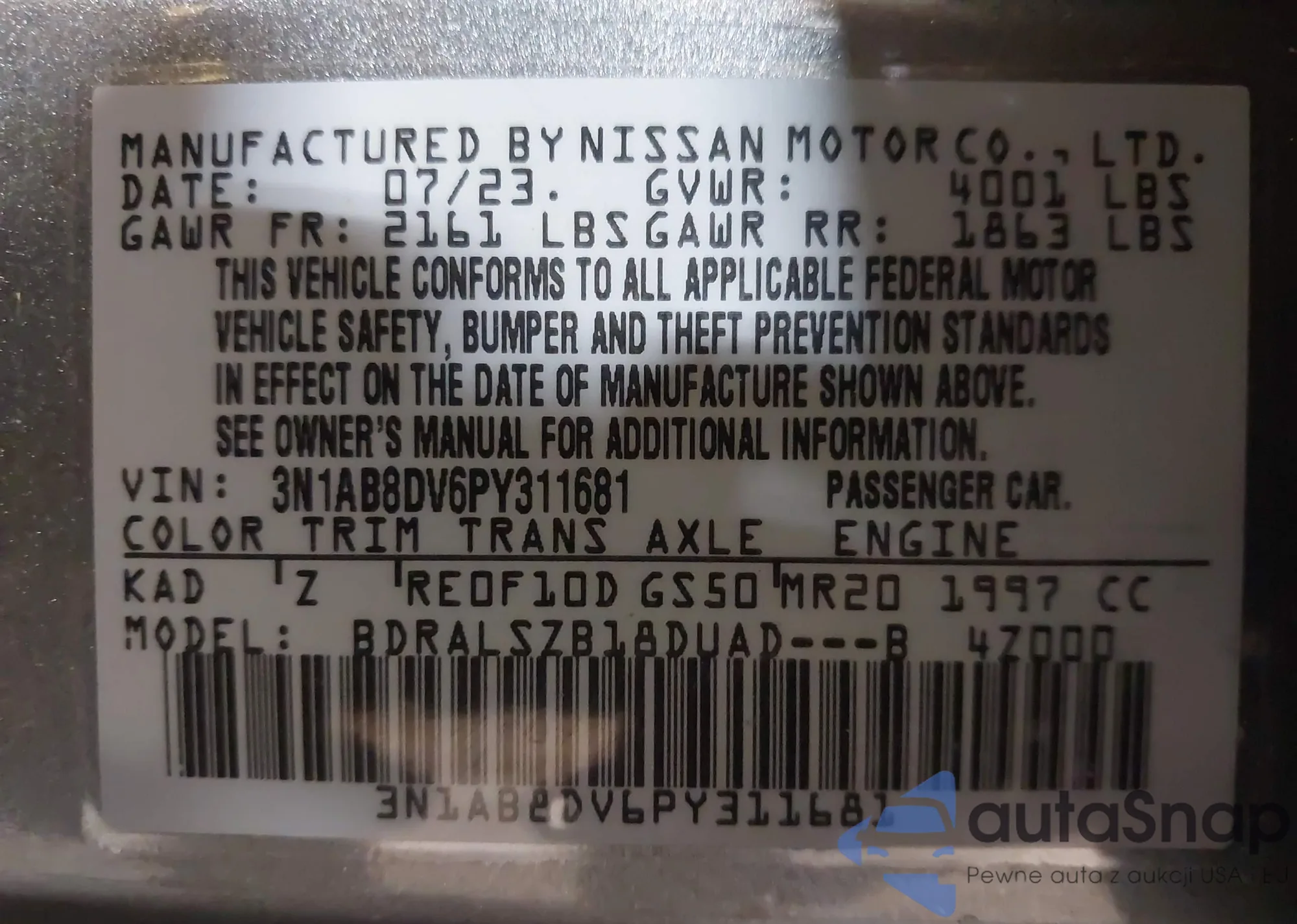 • VIN: 3N1AB8DV6PY311681