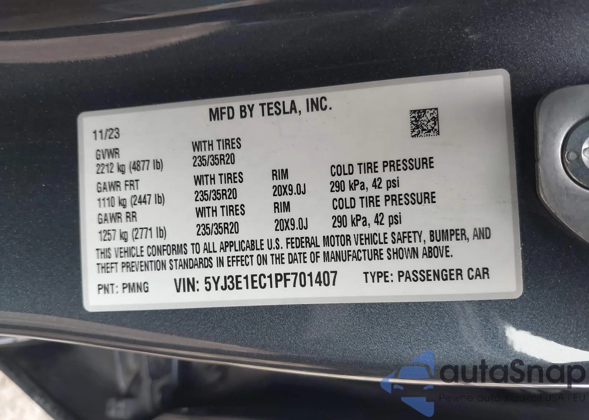 Samochód Tesla Model 3 2023 (VIN 5YJ3E1EC1PF701407) ma dokumenty uniemożliwiające rejestrację. Mogą pojawić się trudności przy eksporcie i rejestracji. Skontaktuj się z ekspertami AutaSnap w celu znalezienia alternatywy.