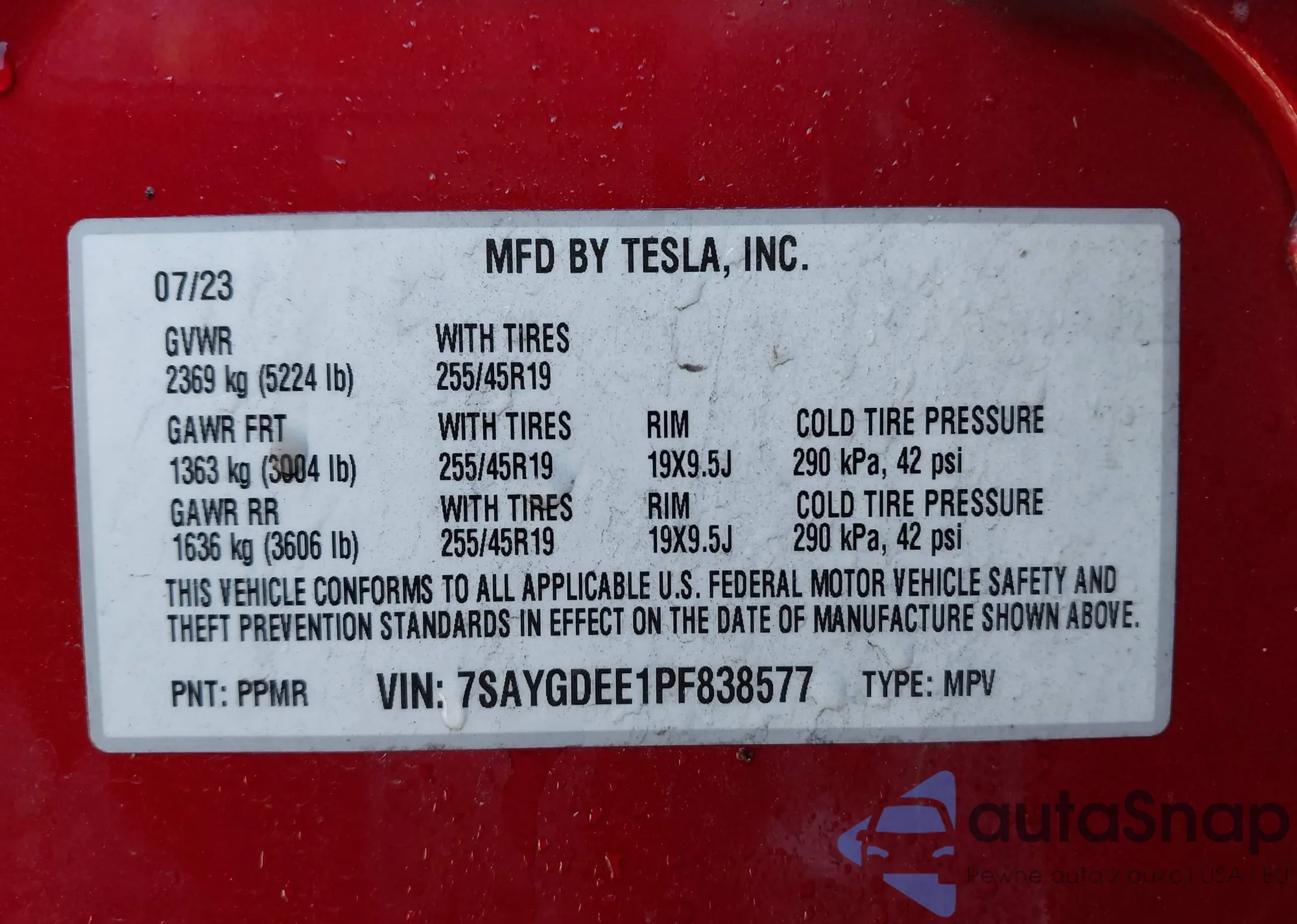 Samochód Tesla Model Y 2023 (VIN 7SAYGDEE1PF838577) ma dokumenty uniemożliwiające rejestrację. Mogą pojawić się trudności przy eksporcie i rejestracji. Skontaktuj się z ekspertami AutaSnap w celu znalezienia alternatywy.