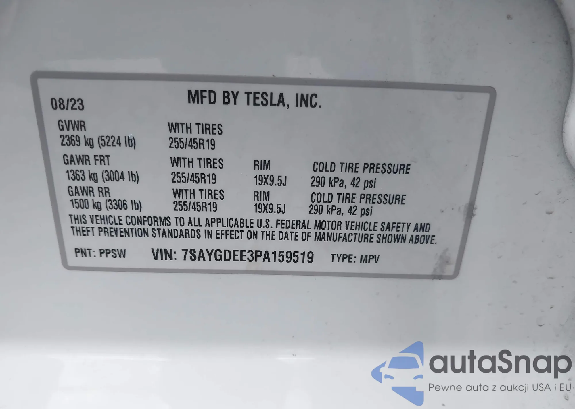 Samochód Tesla Model Y 2023 (VIN 7SAYGDEE3PA159519) nie był wcześniej licytowany. Dokumenty są czyste, przebieg odpowiada lub jest niższy niż średnia rynku. Sprzedaje go firma ubezpieczeniowa – polecamy zakup. Dostawa do portu zajmie ok. 6–8 tygodni.