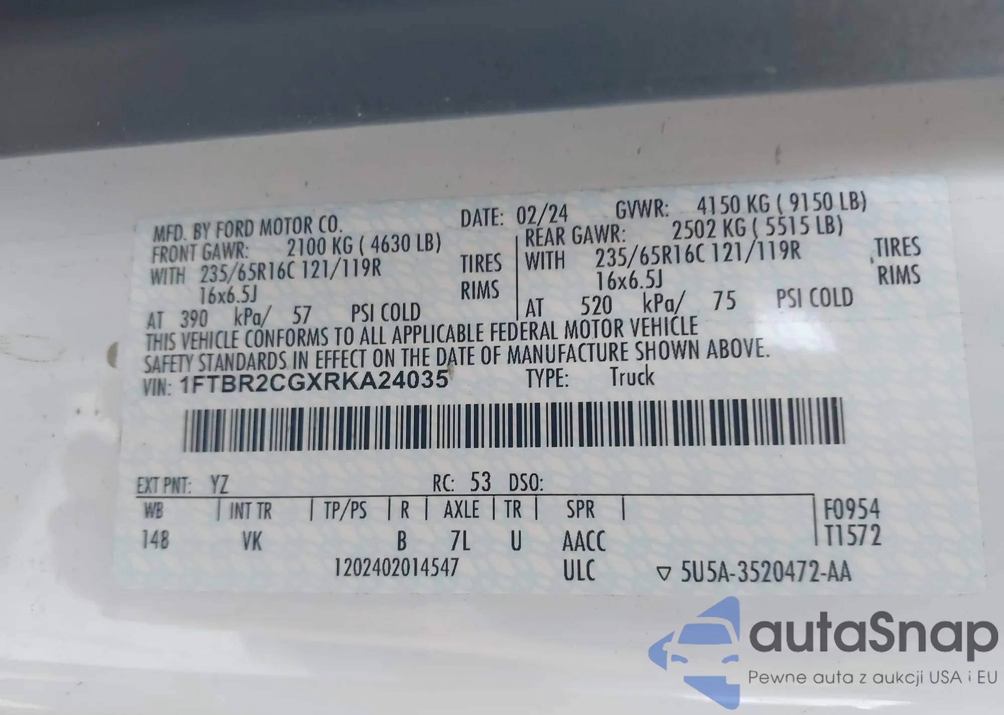 Samochód Ford Transit 2024 (VIN 1FTBR2CGXRKA24035) nie był wcześniej licytowany. Dokumenty są czyste, przebieg odpowiada lub jest niższy niż średnia rynku. Sprzedaje go firma ubezpieczeniowa – polecamy zakup. Dostawa do portu zajmie ok. 6–8 tygodni.