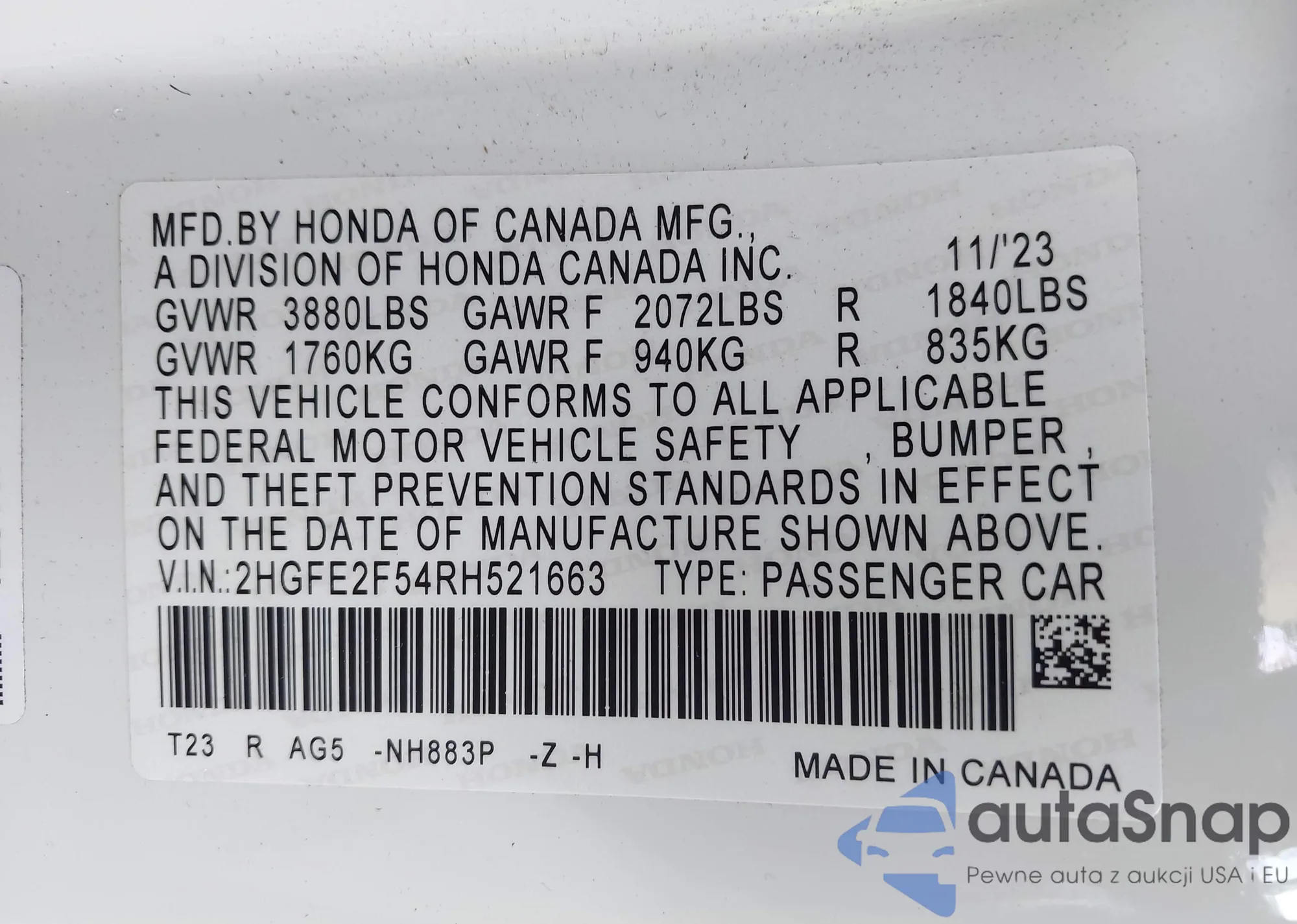 Samochód Honda Civic 2024 (VIN 2HGFE2F54RH521663) nie był wcześniej licytowany. Dokumenty są czyste, przebieg odpowiada lub jest niższy niż średnia rynku. Sprzedaje go firma ubezpieczeniowa – polecamy zakup. Dostawa do portu zajmie ok. 6–8 tygodni.
