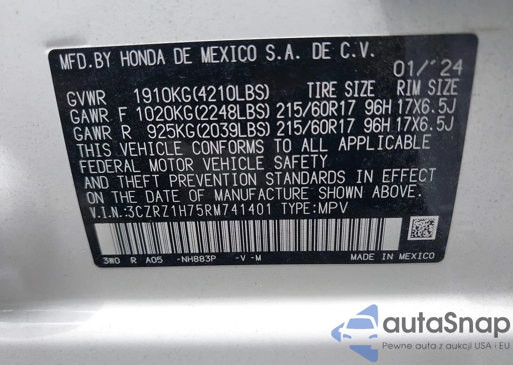 Samochód Honda HR-V 2024 (VIN 3CZRZ1H75RM741401) nie był wcześniej licytowany. Dokumenty są czyste, przebieg odpowiada lub jest niższy niż średnia rynku. Sprzedaje go firma ubezpieczeniowa – polecamy zakup. Dostawa do portu zajmie ok. 6–8 tygodni.