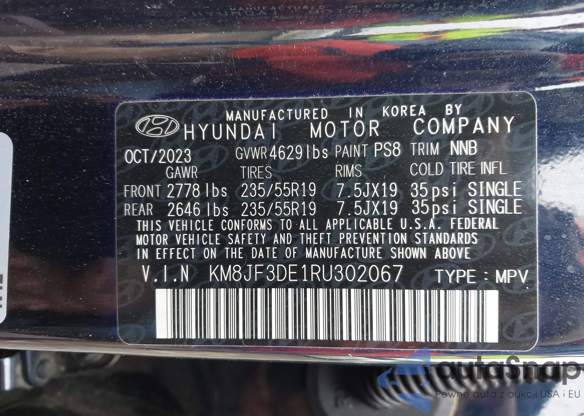 Samochód Hyundai Tucson 2024 (VIN KM8JF3DE1RU302067) nie był wcześniej licytowany. Dokumenty są czyste, przebieg odpowiada lub jest niższy niż średnia rynku. Sprzedaje go firma ubezpieczeniowa – polecamy zakup. Dostawa do portu zajmie ok. 6–8 tygodni.