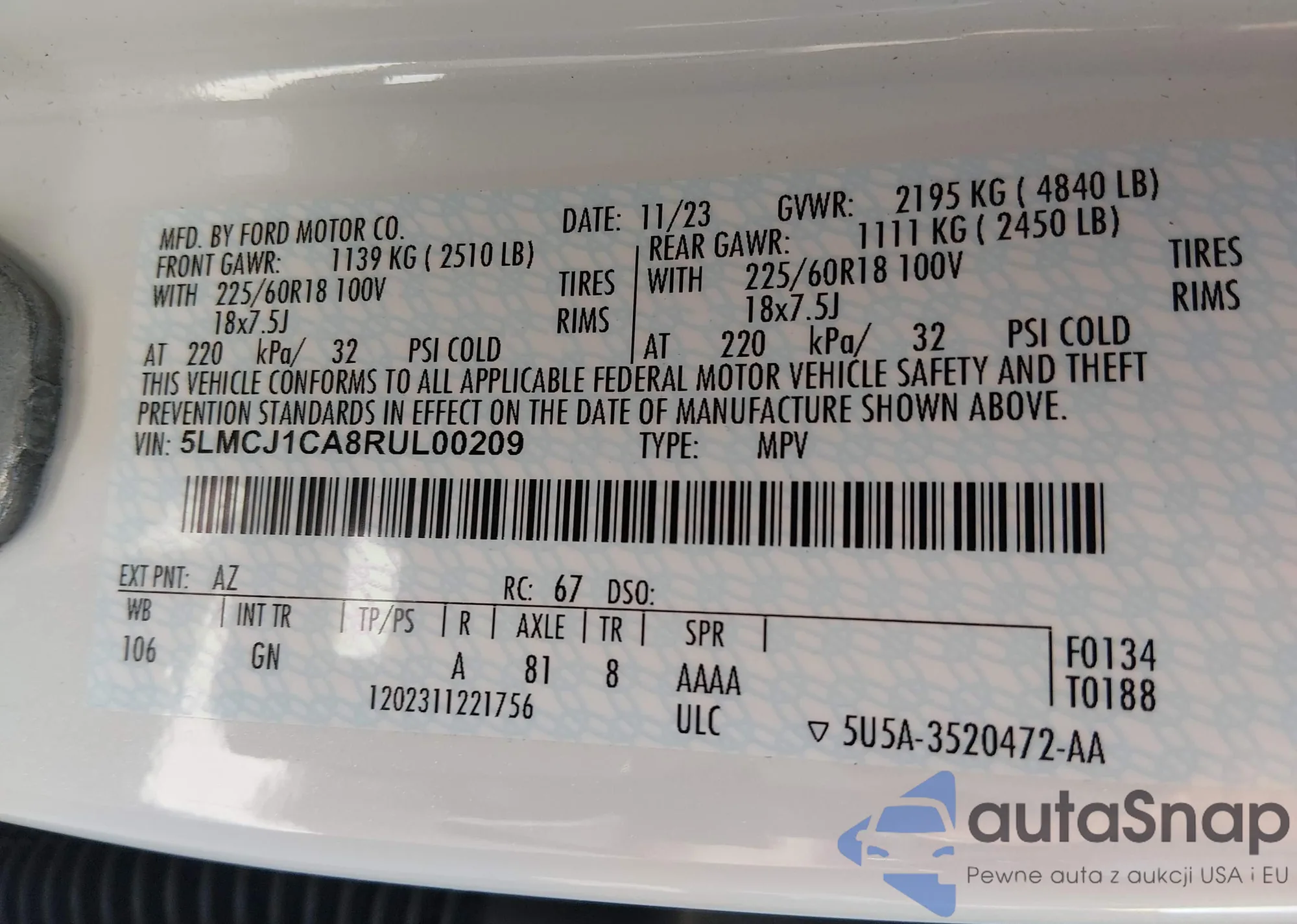 • VIN: 5LMCJ1CA8RUL00209