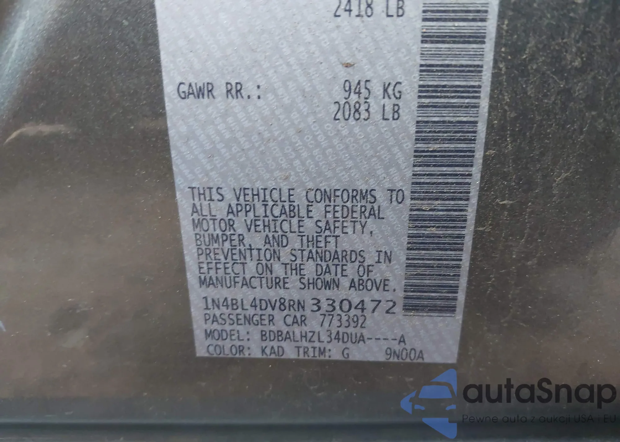 • VIN: 1N4BL4DV8RN330472