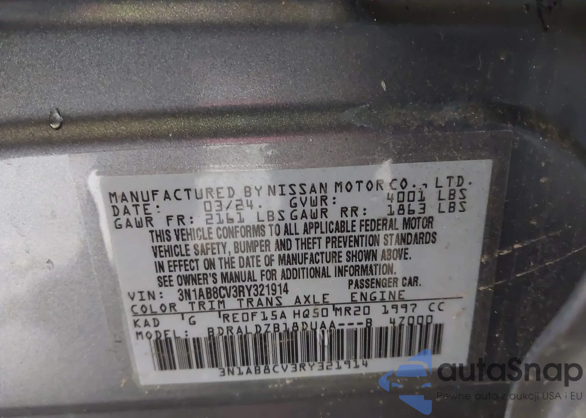 Samochód Nissan Sentra 2024 (VIN 3N1AB8CV3RY321914) nie był wcześniej licytowany. Dokumenty są czyste, przebieg odpowiada lub jest niższy niż średnia rynku. Sprzedaje go firma ubezpieczeniowa – polecamy zakup. Dostawa do portu zajmie ok. 6–8 tygodni.