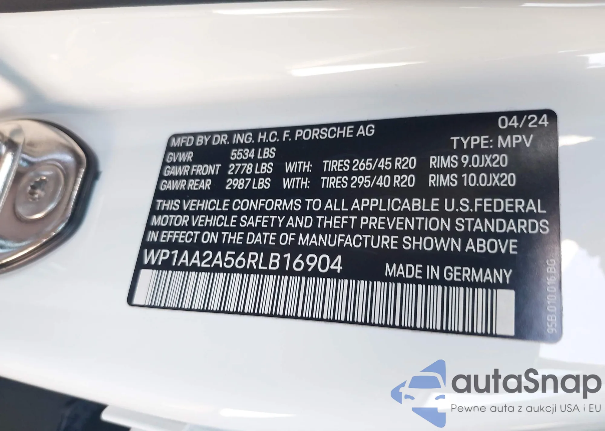 Samochód Porsche Macan 2024 (VIN WP1AA2A56RLB16904) nie był wcześniej licytowany. Dokumenty są czyste, przebieg odpowiada lub jest niższy niż średnia rynku. Sprzedaje go firma ubezpieczeniowa – polecamy zakup. Dostawa do portu zajmie ok. 6–8 tygodni.