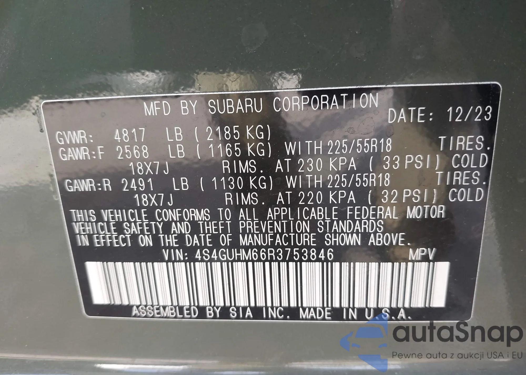Samochód Subaru XV 2024 (VIN 4S4GUHM66R3753846) nie był wcześniej licytowany. Dokumenty są czyste, przebieg odpowiada lub jest niższy niż średnia rynku. Sprzedaje go firma ubezpieczeniowa – polecamy zakup. Dostawa do portu zajmie ok. 6–8 tygodni.