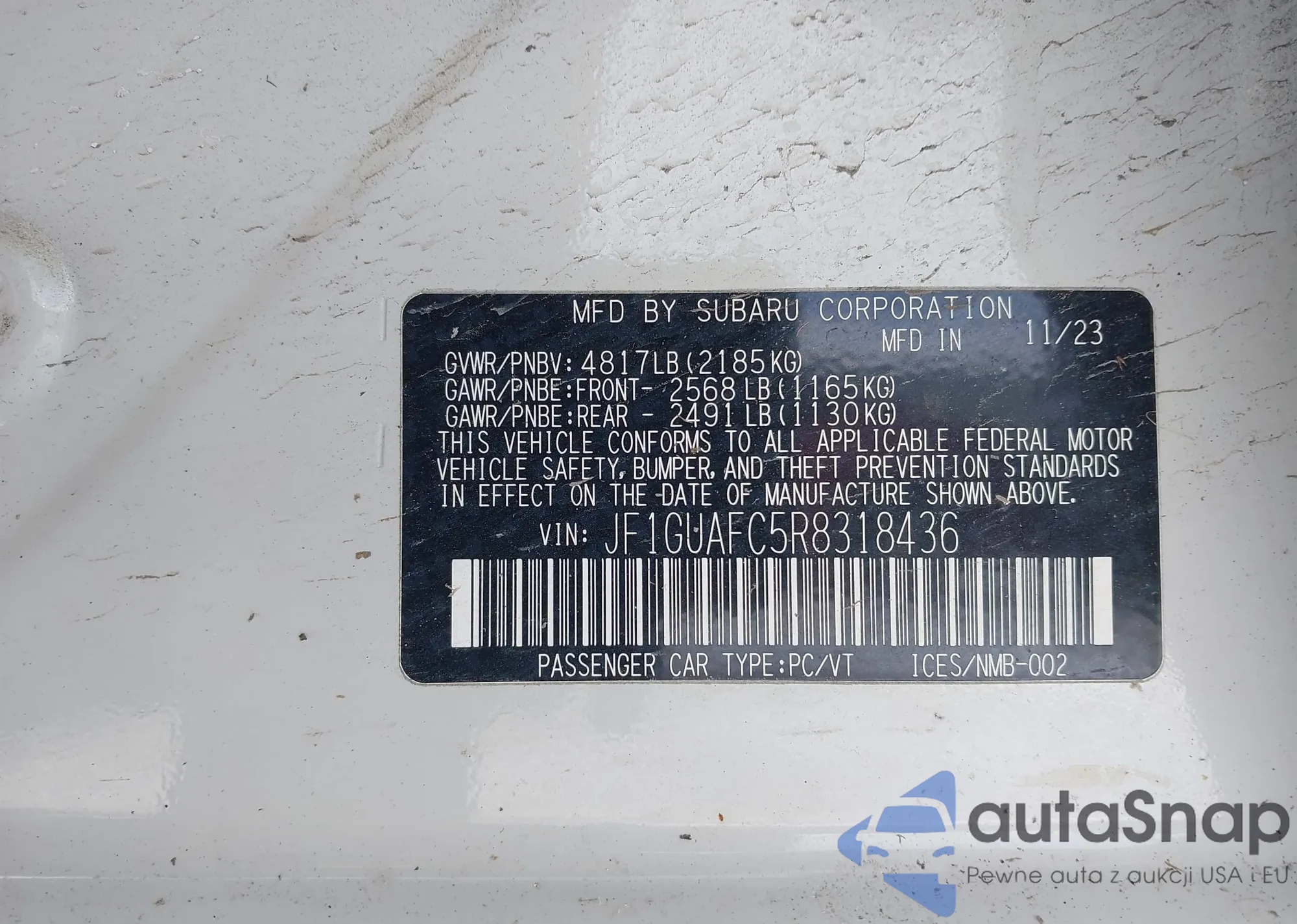 Samochód Subaru Impreza 2024 (VIN JF1GUAFC5R8318436) nie był wcześniej licytowany. Dokumenty są czyste, przebieg odpowiada lub jest niższy niż średnia rynku. Sprzedaje go firma ubezpieczeniowa – polecamy zakup. Dostawa do portu zajmie ok. 6–8 tygodni.