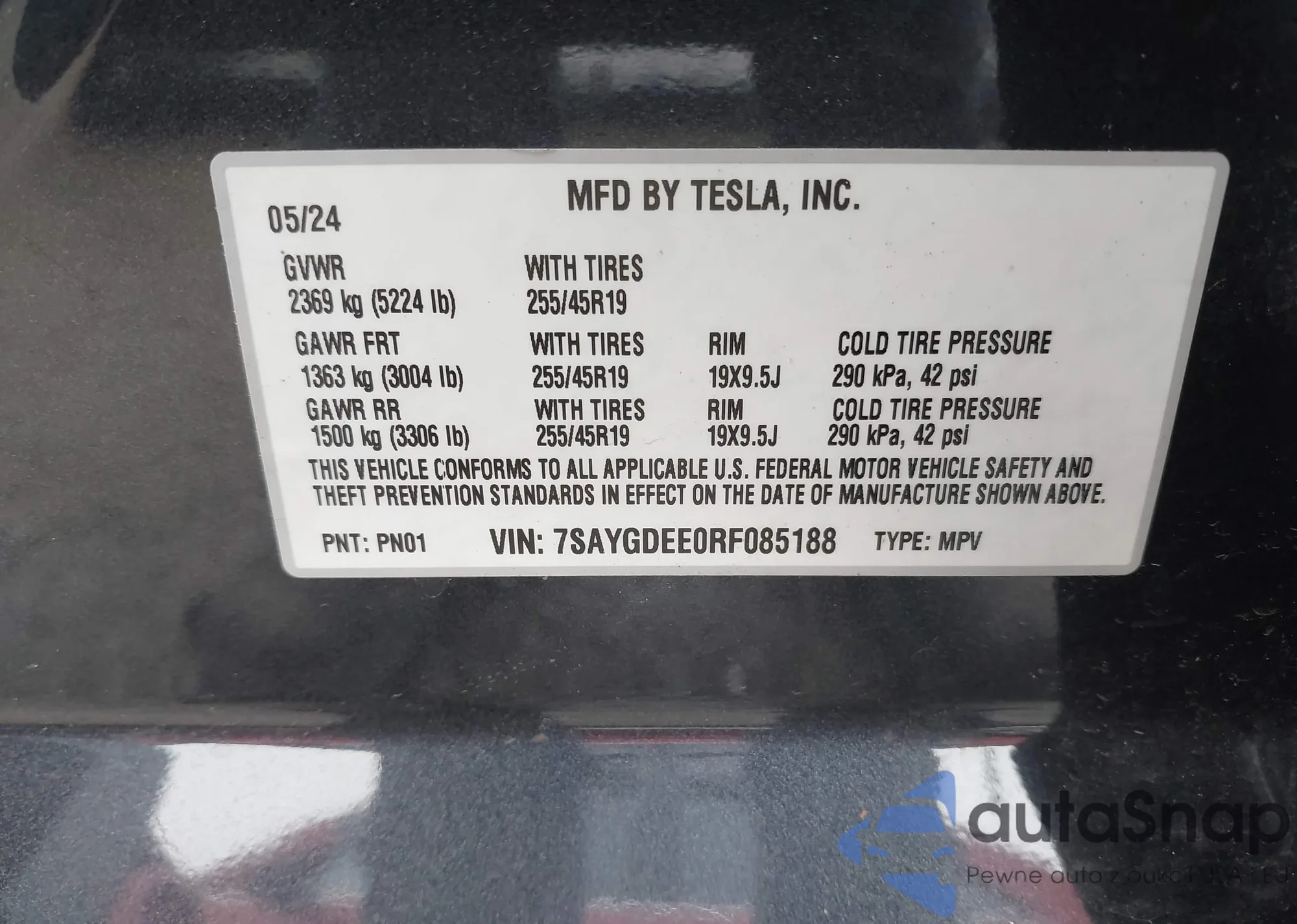 Samochód Tesla Model Y 2024 (VIN 7SAYGDEE0RF085188) ma dokumenty uniemożliwiające rejestrację. Mogą pojawić się trudności przy eksporcie i rejestracji. Skontaktuj się z ekspertami AutaSnap w celu znalezienia alternatywy.