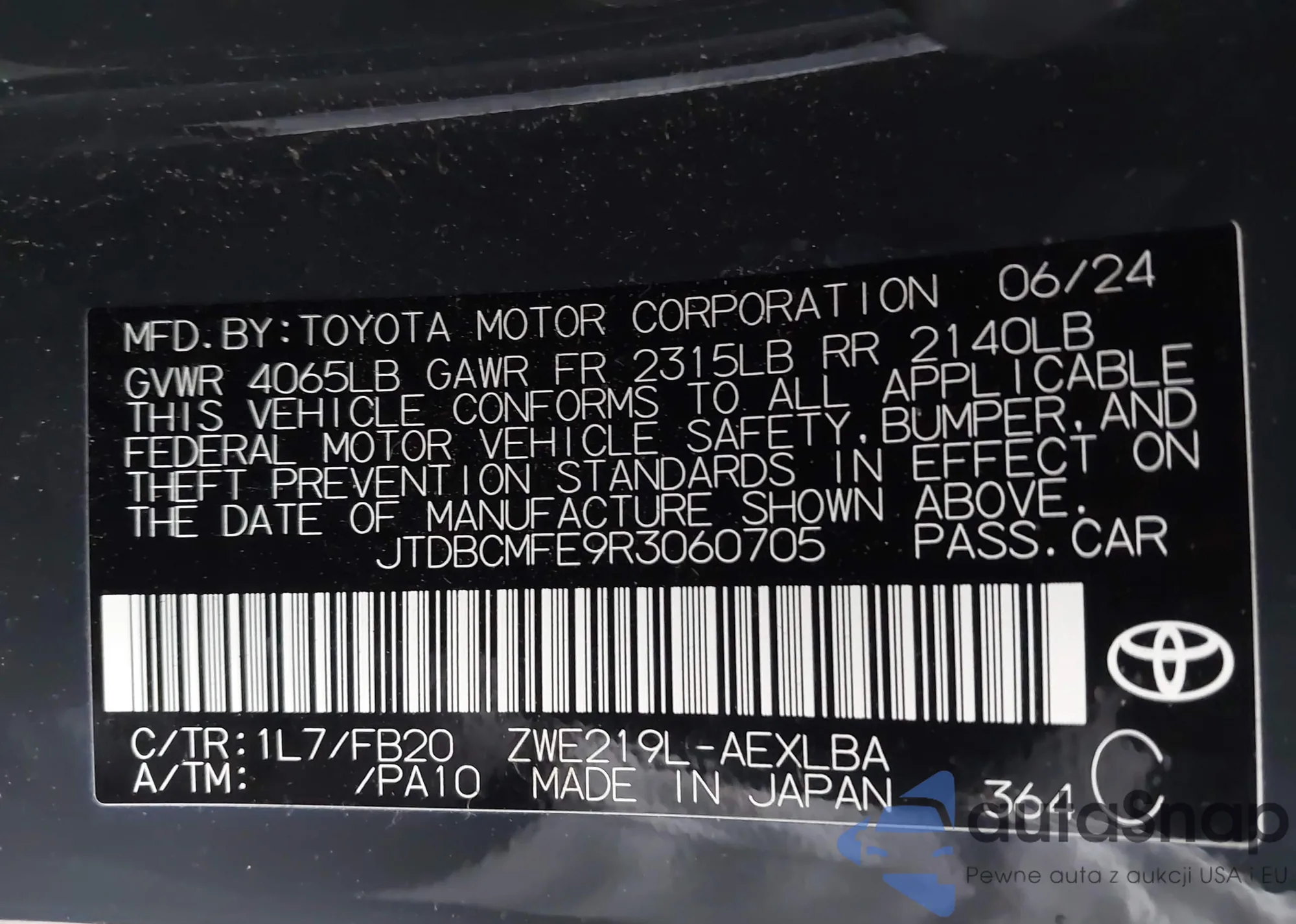 Samochód Toyota Corolla 2024 (VIN JTDBCMFE9R3060705) nie był wcześniej licytowany. Dokumenty są czyste, przebieg odpowiada lub jest niższy niż średnia rynku. Sprzedaje go firma ubezpieczeniowa – polecamy zakup. Dostawa do portu zajmie ok. 6–8 tygodni.